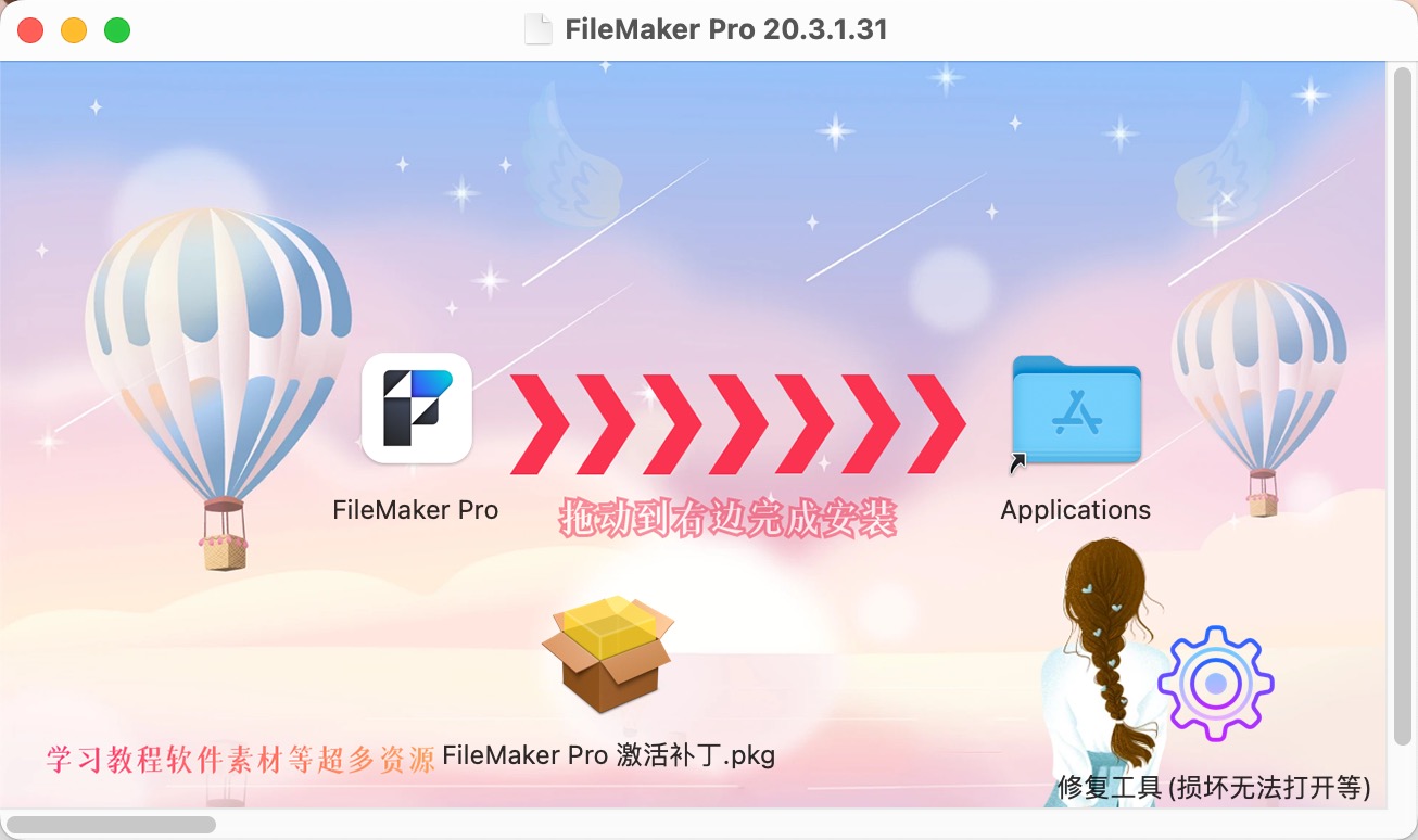 软件下载完成后打开,拖到FileMaker Pro到右边的应用程序中进行安装,安装完成后打开软件,点击开始试用进入试用,然后关闭软件,然后双击安装破解补丁。