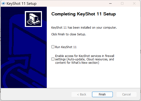 1、下载解压keyshot 11版安装包,双击安装程序,根据提示点击next,选择安装目录和资源位置文件夹安装位置,直到最后一步安装完毕,把前面的两个勾先去掉,先不运行keyshot 11,点击“Finish”。