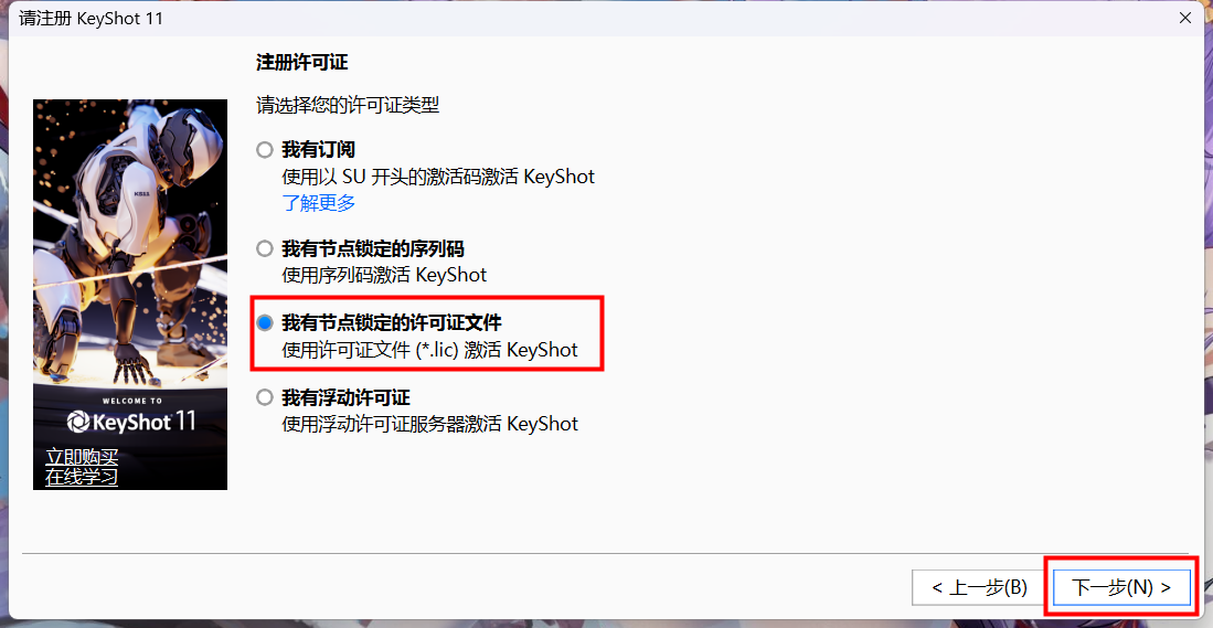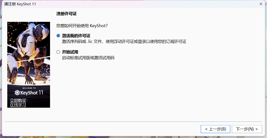 6、运行keyshot11,点下一步,选择激活我的许可证,再点下一步。
