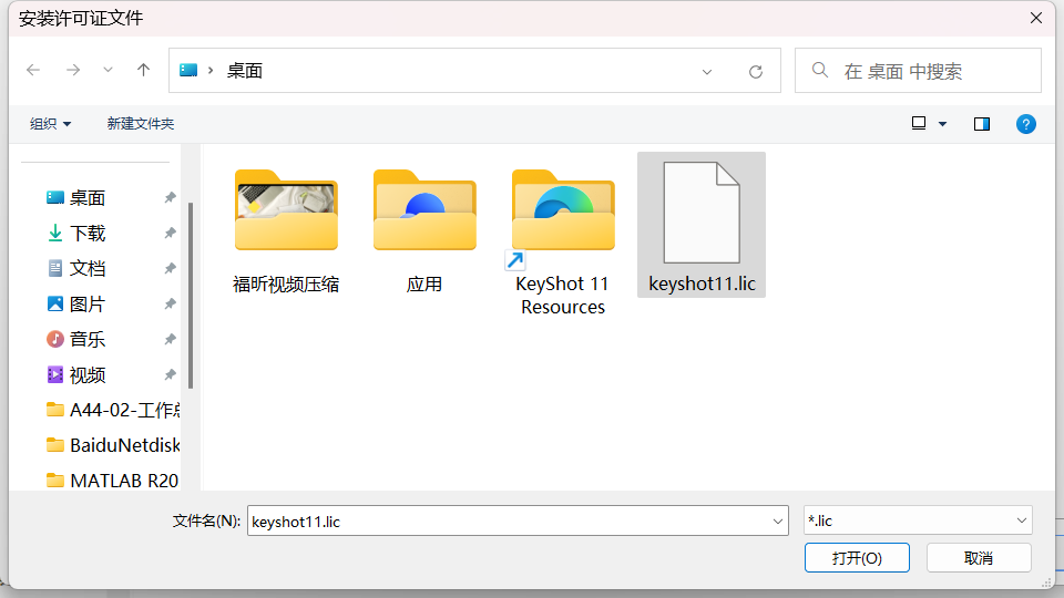 8、选择刚刚保存在桌面上的keyshot许可证keyshot11.lic,并点击“打开”