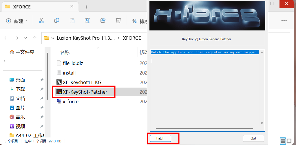 2、打开安装包里的XFORCE文件夹,然后打开运行XF-KeyShot-Patcher,点击patch,再点确定。