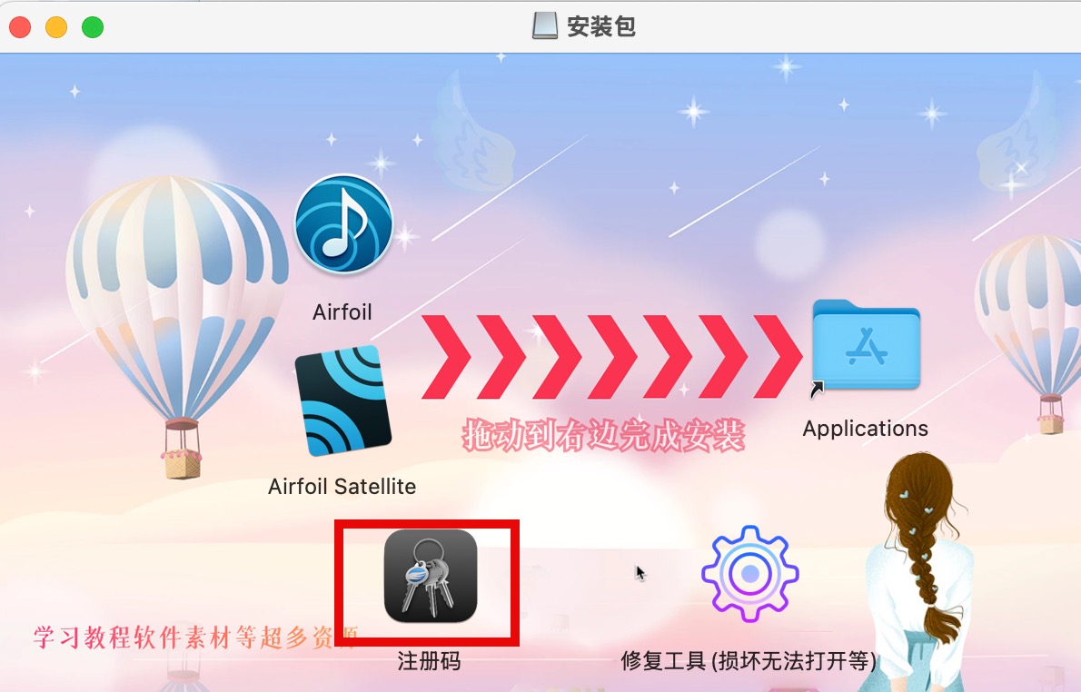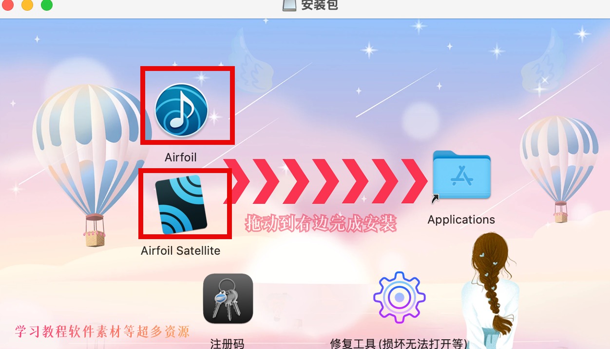 将左侧AIrfoil和AIrfoil Satellite都拖入右侧应用程序中进行安装5.12.3安装包打开后将左侧AIrfoil和AIrfoil Satellite都拖入右侧应用程序中进行安装‘