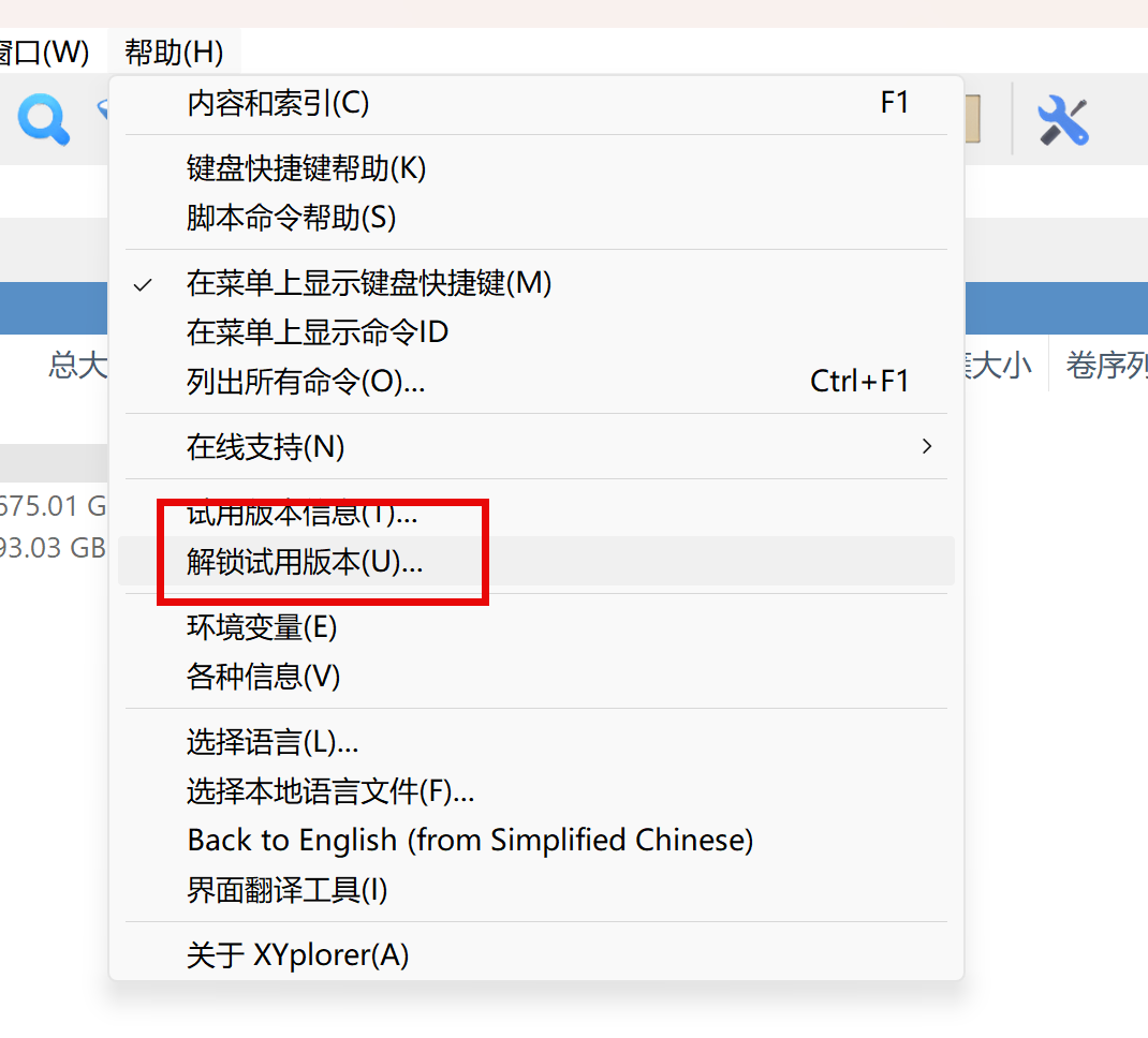 软件显示为试用版本,菜单栏帮助下拉选择解锁试用版本