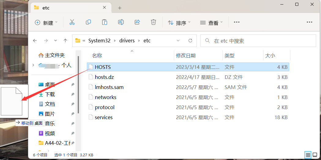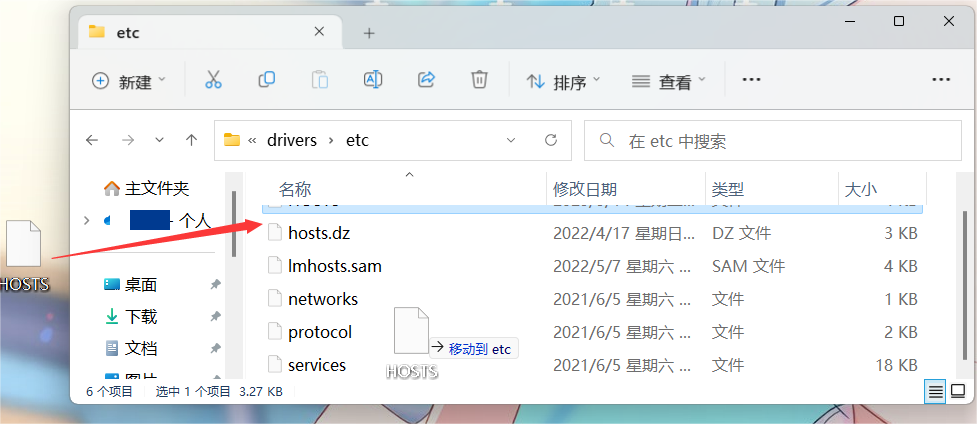 7、把“hosts”拖回或者复制粘贴回原来的位置(C:\Windows\System32\drivers\etc)。