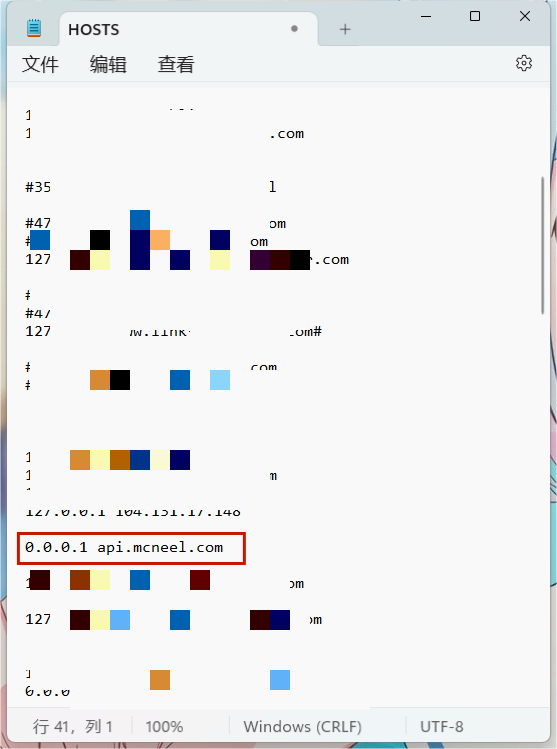 6、复制“127.0.0.1 api.mcneel.com”粘贴在hosts文本中,不要加#,然后保存。如图所示: