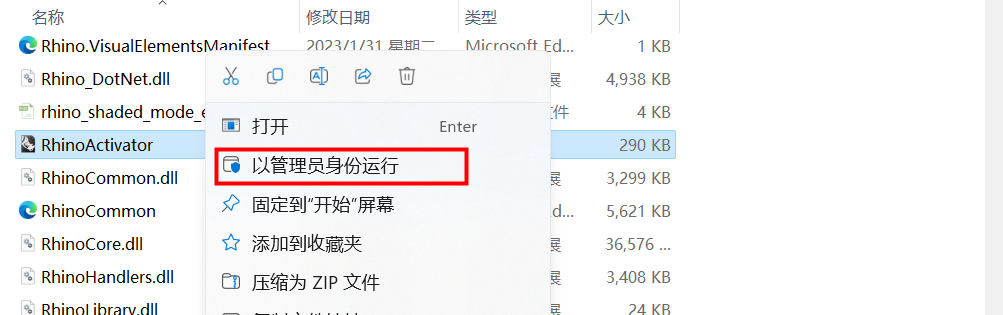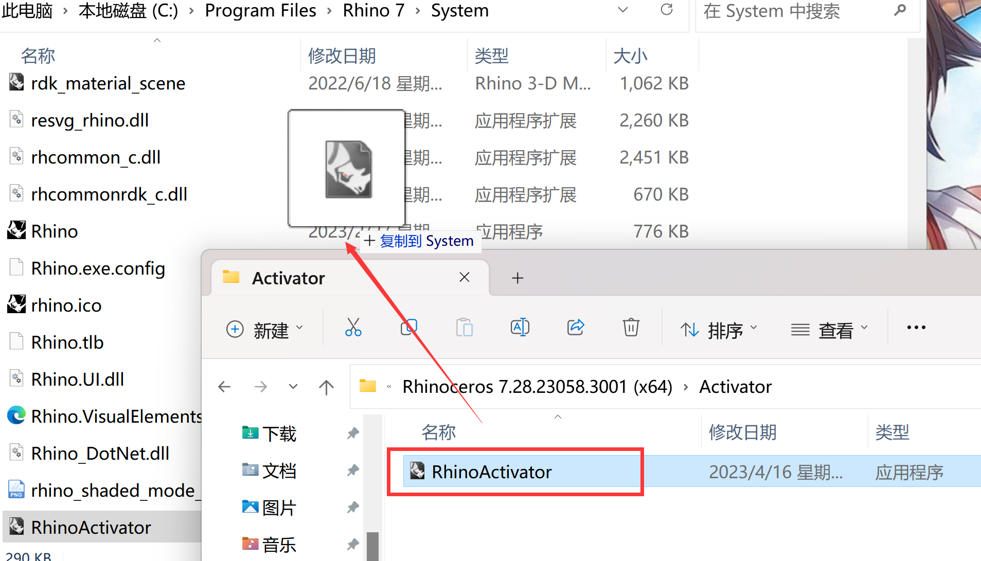 8、打开安装包里的Activator文件夹,复制RhinoActivator到Rhinoceros7安装目录之中(安装目录在桌面找到“Rhino 7”软件图标,鼠标右键选择“打开文件所在的位置”)。