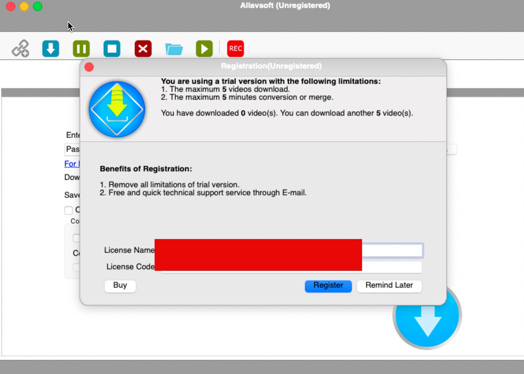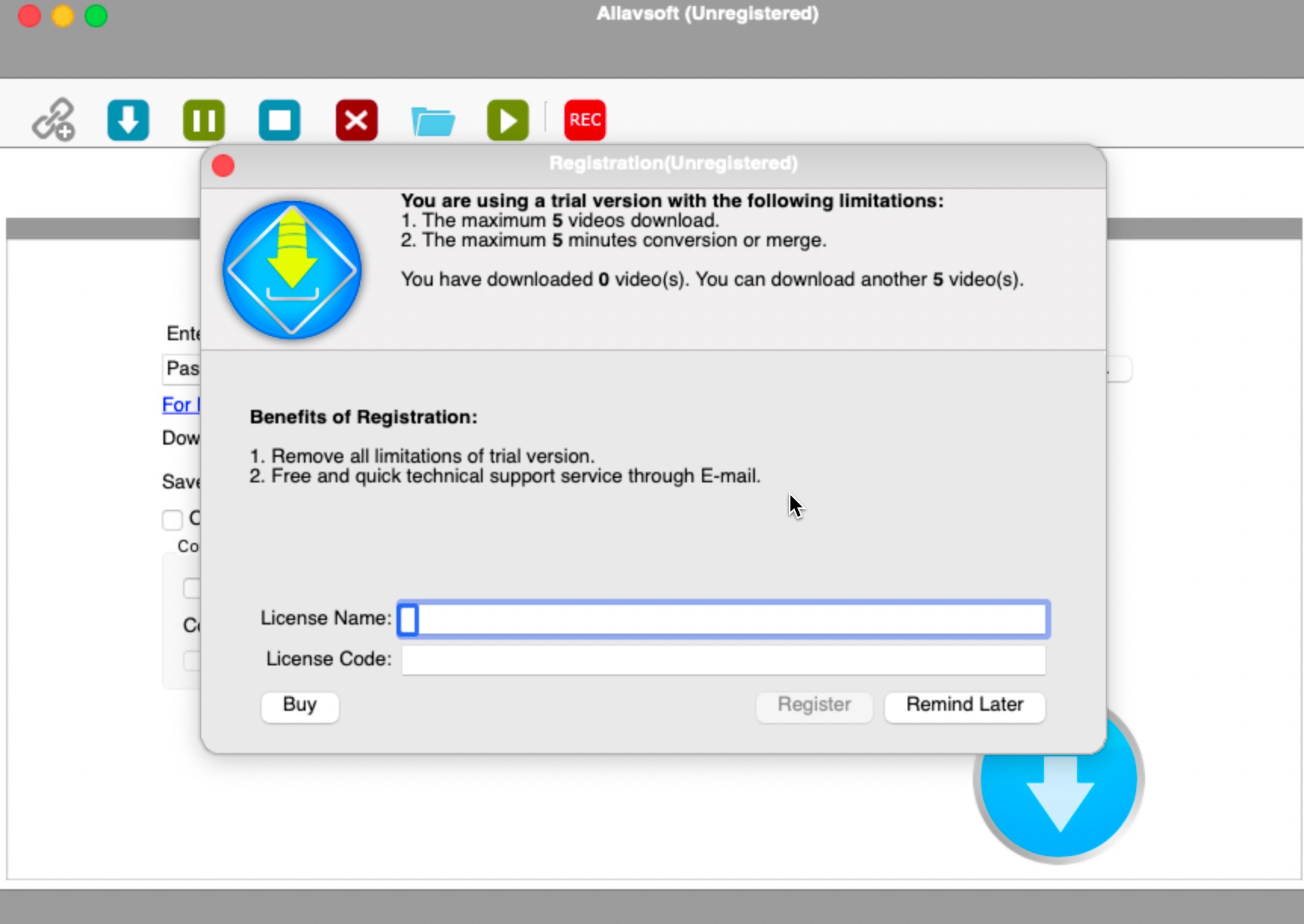 安装好Allavsoft后自动弹出激活窗口,留做待用。
