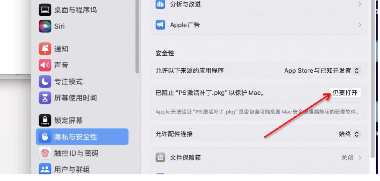 如果未打开“AI激活补丁.pkg,也需要在系统设置隐私与安全性里面点击仍要打开