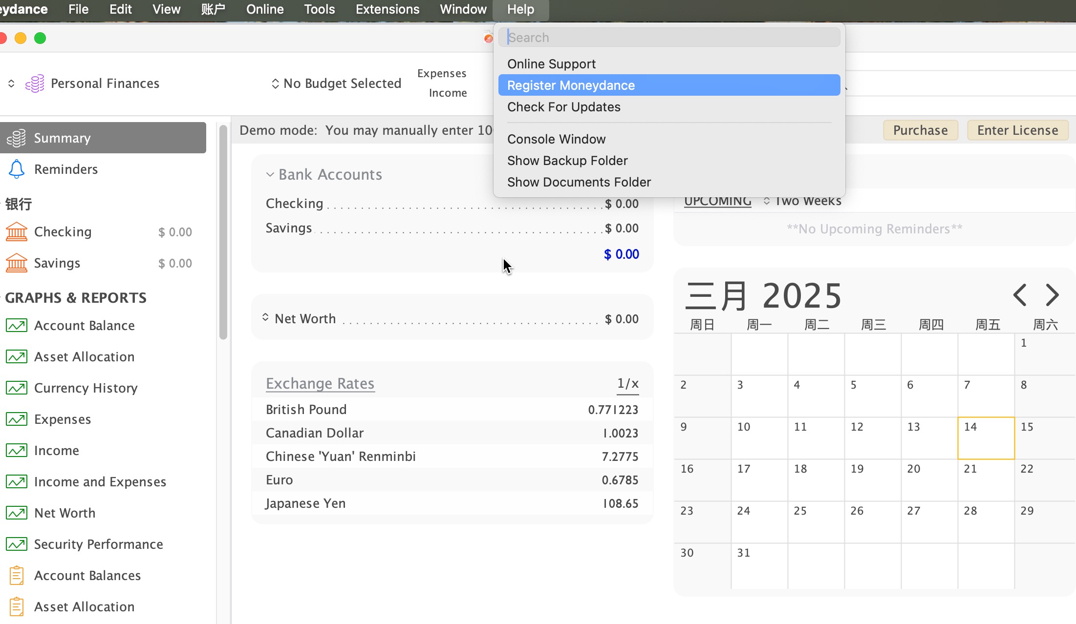 2、依次点击 Help→Register Moneydance→输入激活码→OK,74D71A07-94A22382
