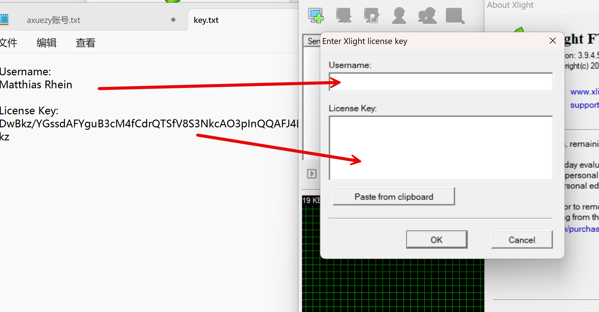 打开安装包内的“Key”文本,将文本框内的注册码依次复制粘贴进软件注册框内,点击“OK”