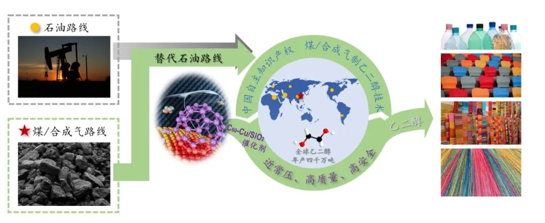 厦门大学谢素原团队与袁友珠团队,联合中国科学院福建物质结构研究所和厦门福纳新材料科技有限公司的研究人员将富勒烯C60作为“电子缓冲剂”用于改性铜—二氧化硅催化剂,研发了以C60电子缓冲来稳定亚铜的富勒烯—铜—二氧化硅催化剂,实现了富勒烯缓冲的铜催化草酸二甲酯在温和压力条件下数千克规模的乙二醇合成,有望降低对石油技术路线的依赖。