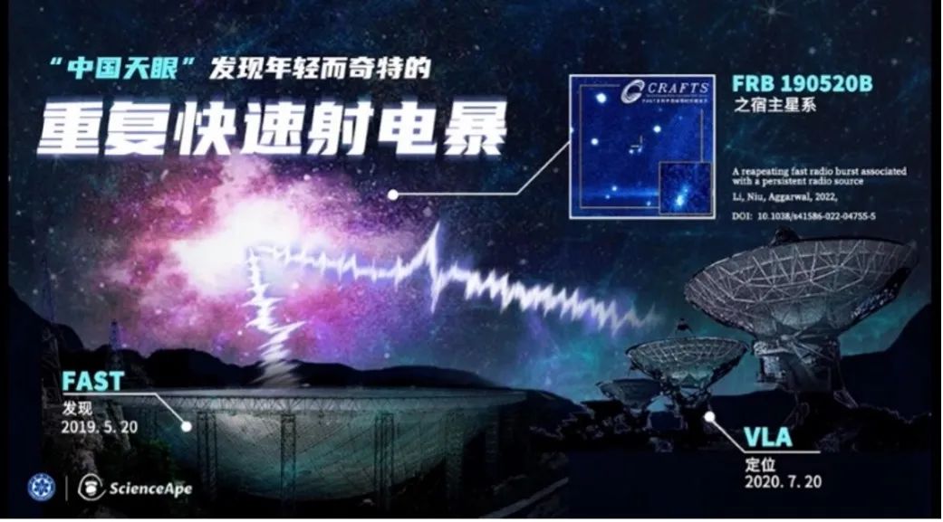 中国科学院国家天文台李菂团队联合北京大学、之江实验室和中国科学院上海天文台团队利用FAST发现了世界首例持续活跃的快速射电暴FRB20190520B,拥有已知最大的环境电子密度,有效推进了FRB多波段研究。通过监测活跃重复暴FRB20201124A,获得了迄今为止最大的FRB偏振样本,探测到FRB局域环境的磁场变化及其频率依赖的偏振振荡现象。针对FRB20190520B、FRB20201124A为代表的活跃重复暴,组织国际合作,特别是美国大型望远镜GBT协同FAST观测,揭示了描述FRB周边环境的单一参数即“RM弥散”,提出了重复快速射电暴偏振频率演化的统一机制。