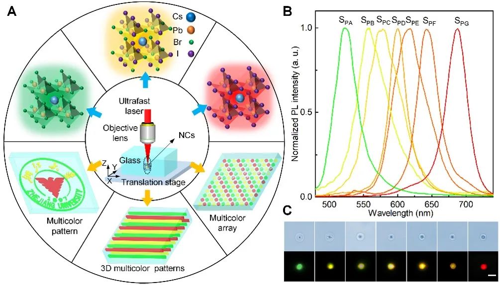 浙江大学邱建荣团队及其合作者们发现了飞秒激光诱导复杂体系微纳结构形成的新机制。以含氯溴碘离子的氧化物玻璃体系为例,实现了玻璃中具有成分和带隙可控发光可调的钙钛矿纳米晶3D直接光刻,呈现红橙黄绿蓝等不同颜色的发光。形成的纳米晶在紫外线辐照、有机溶液浸泡和250℃高温环境中表现出显著的稳定性。并进一步演示了这种3D微纳结构在超大容量长寿命信息存储、高稳定的最小像素尺寸微米级的Micro-LED列阵,实现了1080p级别动态立体彩色全息显示。