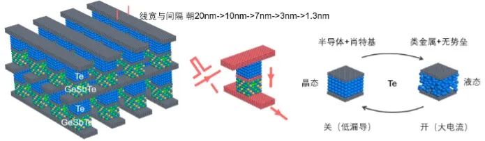 中国科学院上海微系统与信息技术研究所宋志棠、朱敏团队发明了一种基于单质碲和氮化钛电极界面效应的新型开关器件,充分发挥纳米尺度二维限定性结构中碲熔融—结晶速度快、功耗低的独特优势,“开态”碲处于熔融状态是类金属,和氮化钛电极形成欧姆接触,提供强大的电流驱动能力,“关态”半导体单质碲和氮化钛电极形成肖特基势垒,彻底夹断电流。