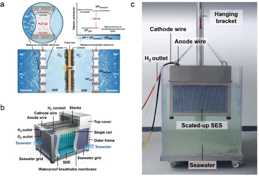 深圳大学/四川大学谢和平团队通过将分子扩散、界面相平衡等物理力学过程与电化学反应结合,开创了海水原位直接电解制氢全新原理与技术,建立了气液界面相变自迁移自驱动的海水直接电解制氢理论方法,形成了界面压力差海水自发相变传质的力学驱动机制,实现了无额外能耗的电化学反应协同海水迁移的动态自调节稳定海水直接电解制氢。