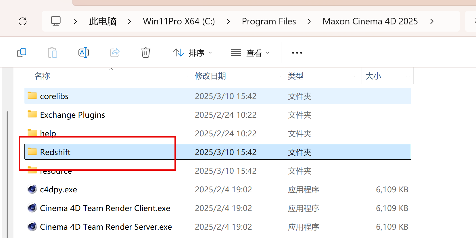 4、删除C:\Program Files\Maxon Cinema 4D 2025中的Redshift文件夹