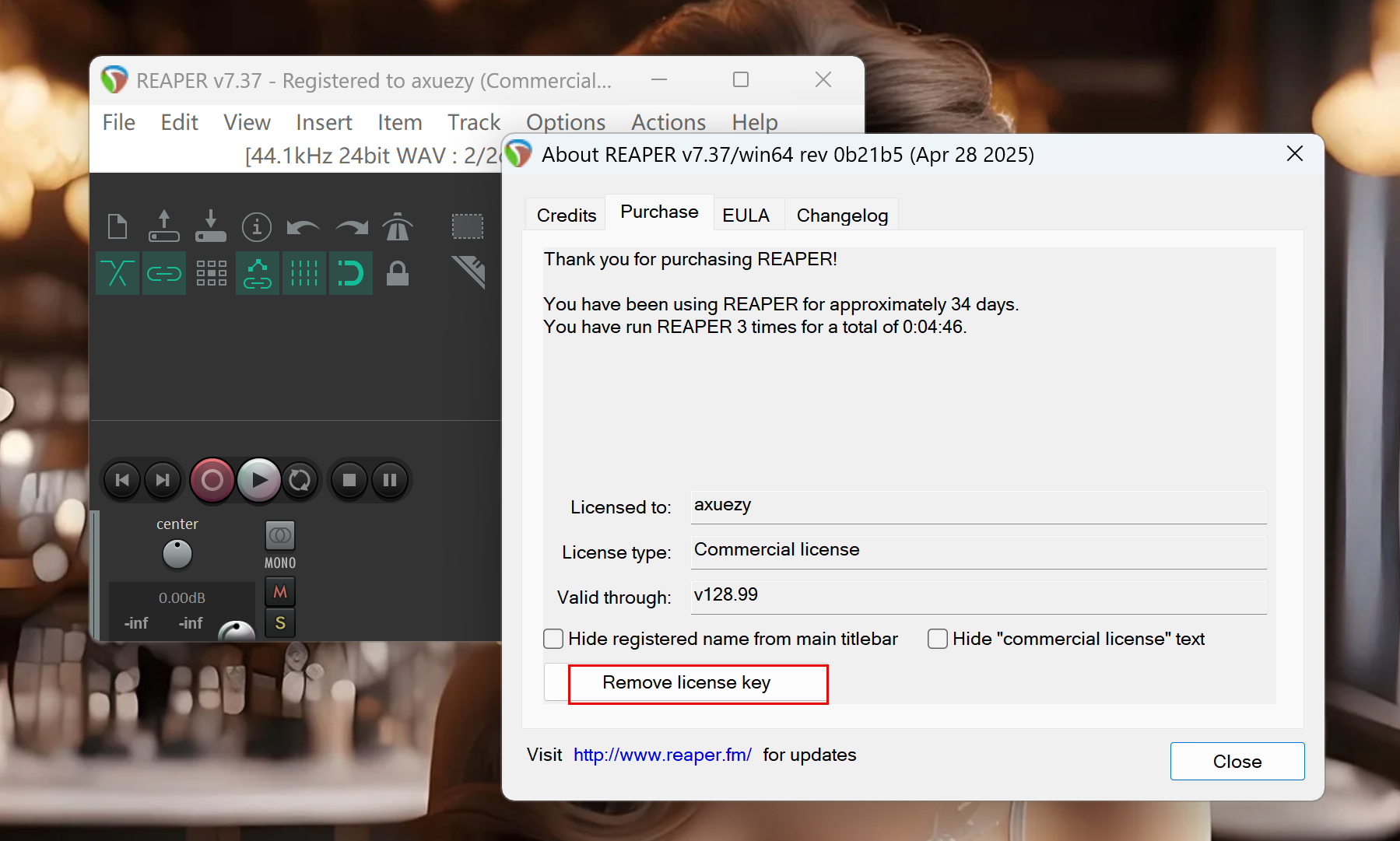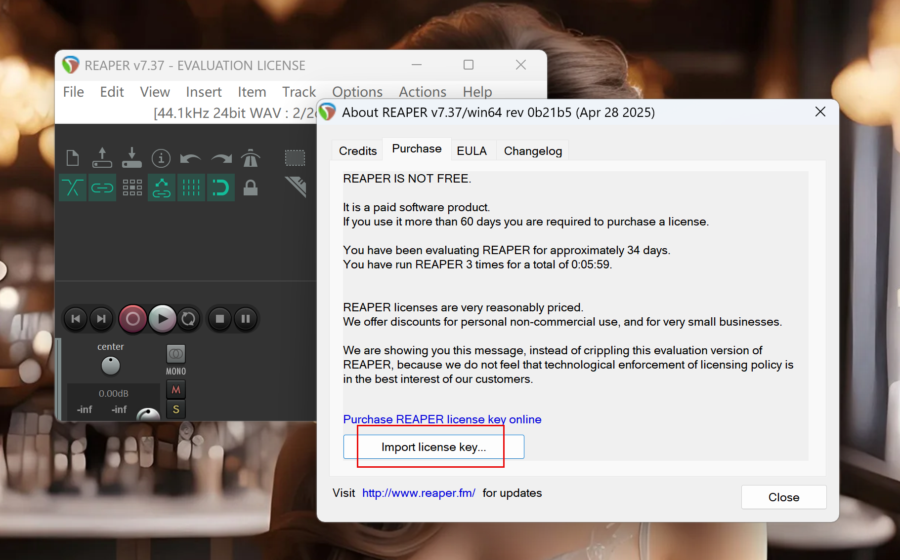 依次打开软件状态栏>>Help>>About REAPER>>Purchase>>Import license key>>Import license key from file,最后选择生成的reaper-license.rk导入即可
