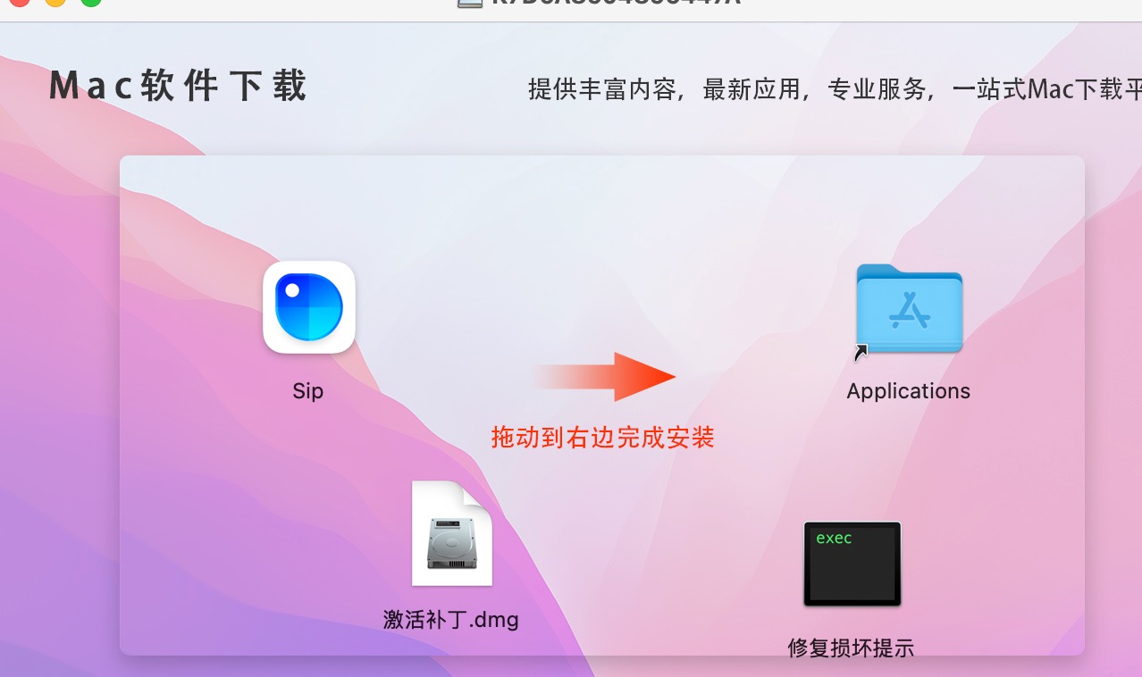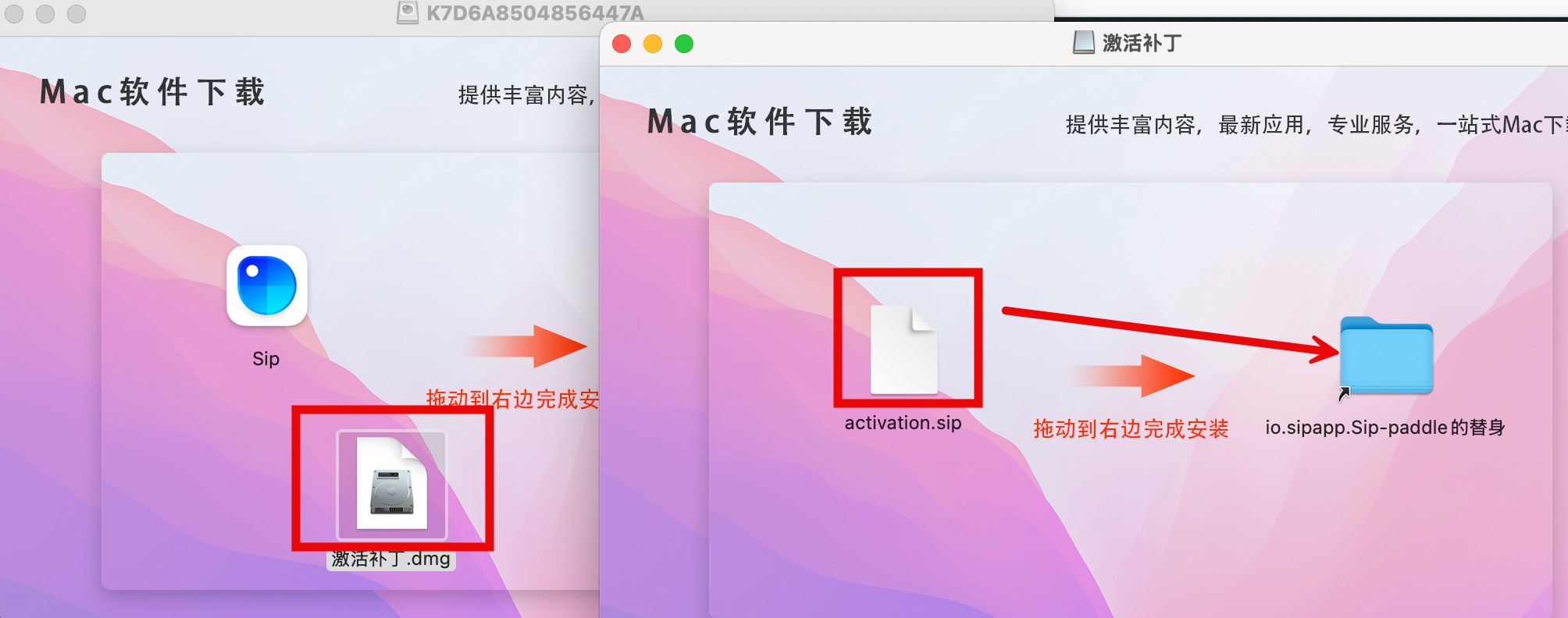 拖动到右边的文件夹中即可完成激/Users/用户名/Library(资源库)/Application Support/io.sipapp.Sip-paddle