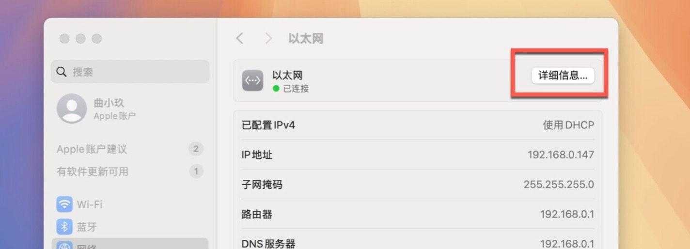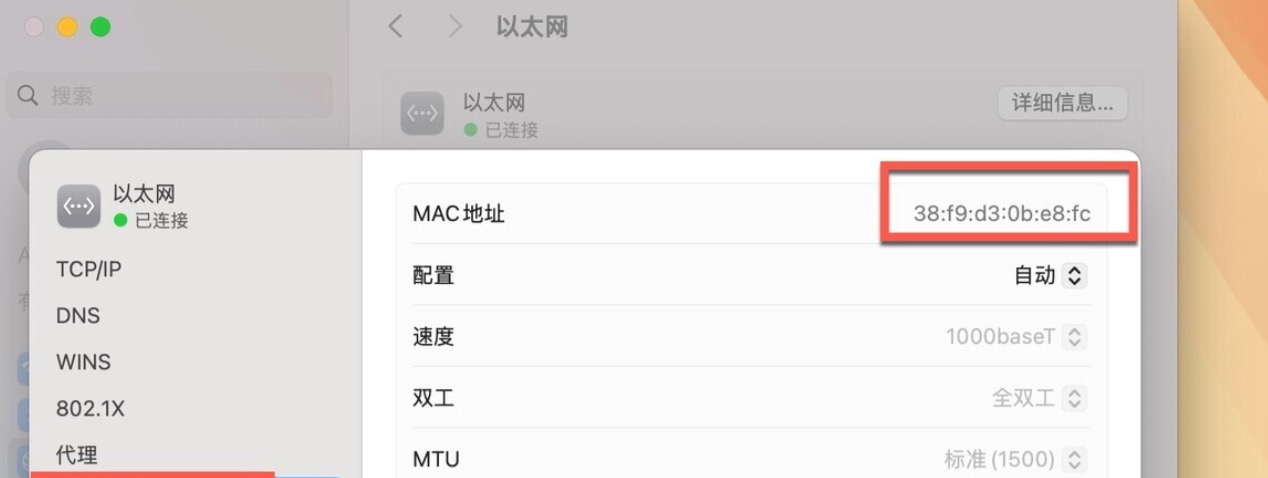 系统设置中依次点击网络-以太网-详细信息-硬件,找到mac地址,并复制 去掉冒号,然后整理⼀下
