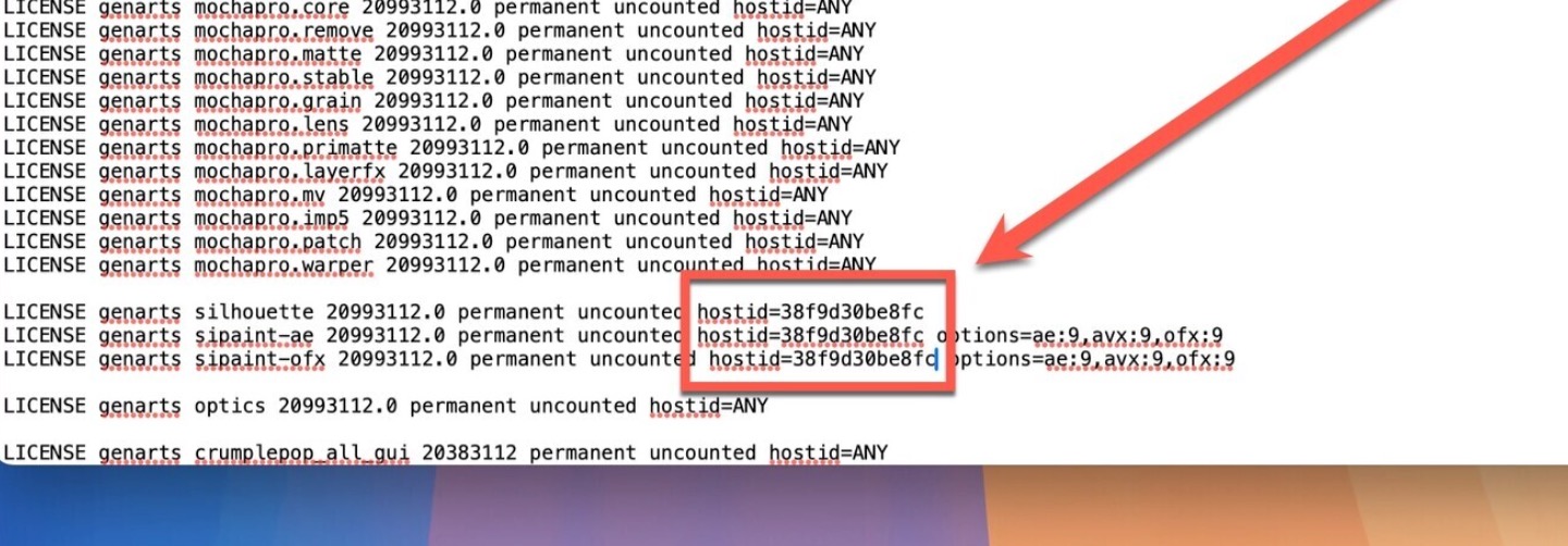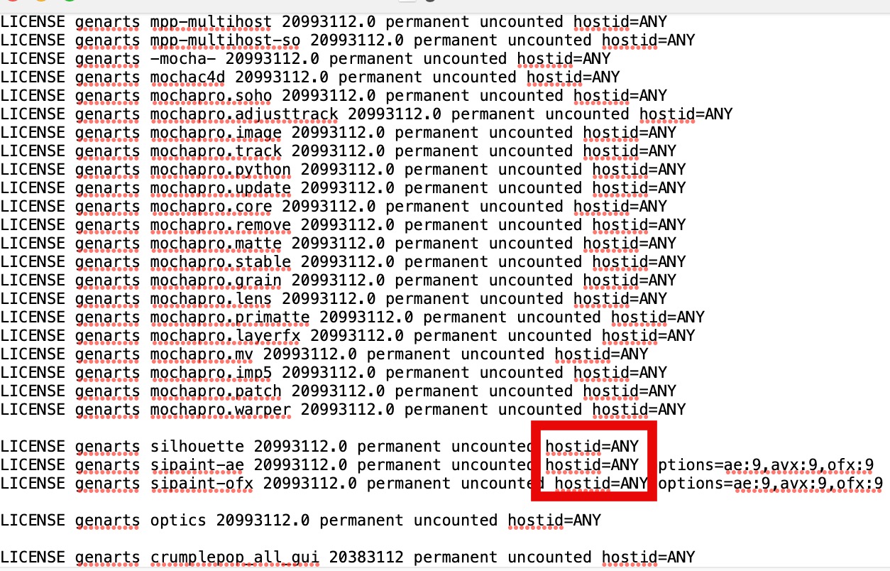 找到打开的genarts.lic补丁,将图中这三⾏的 hostid=ANY 替换成上⼀步获得的 mac 地址(去掉冒号后的)
