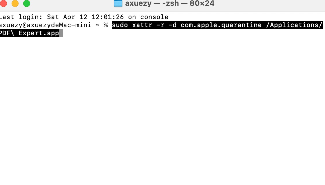 sudo xattr -r -d com.apple.quarantine /Applications/PDF\ Expert.app