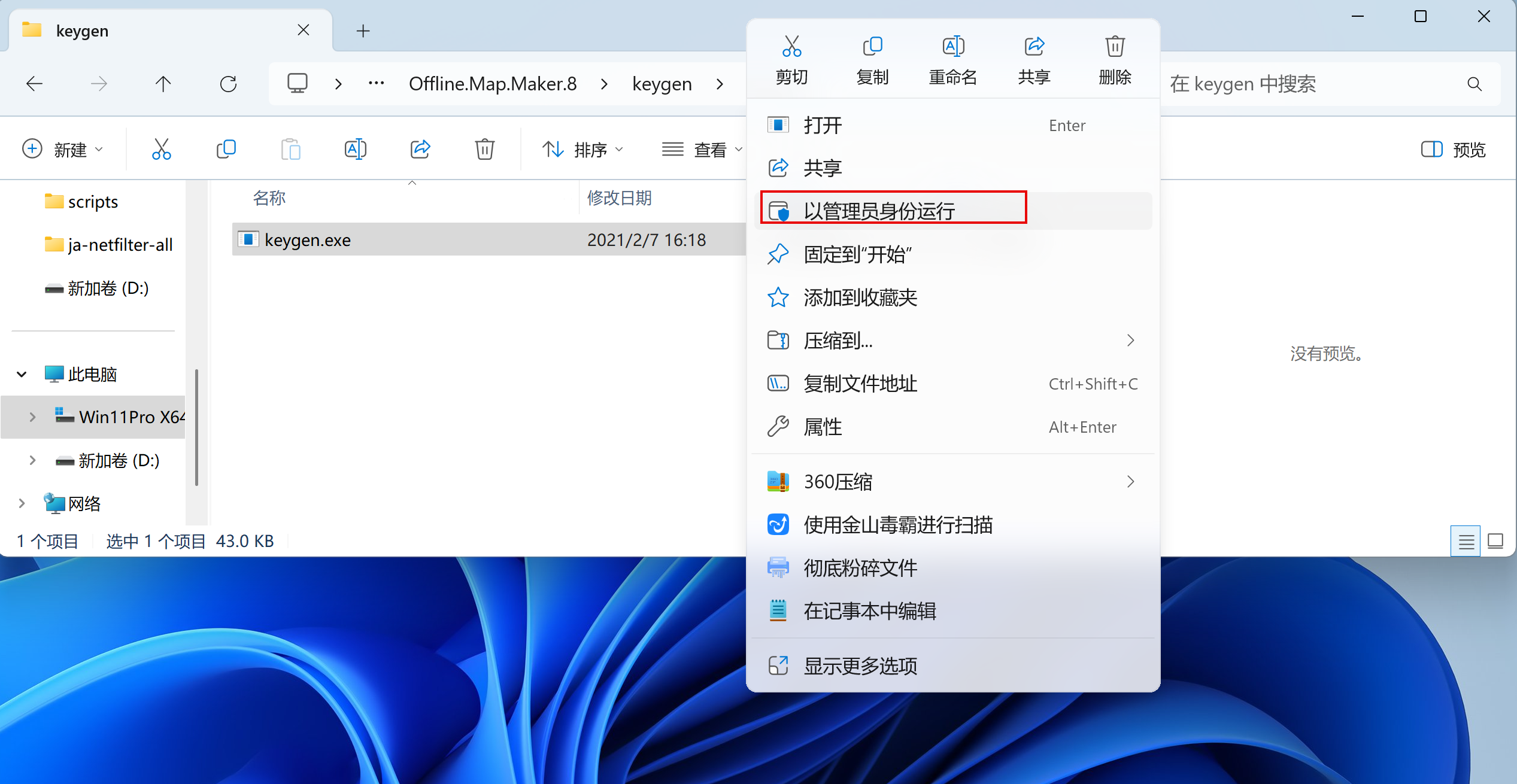 返回到安装包右键解压keygen.7z压缩包,以管理员身份运行Keygen