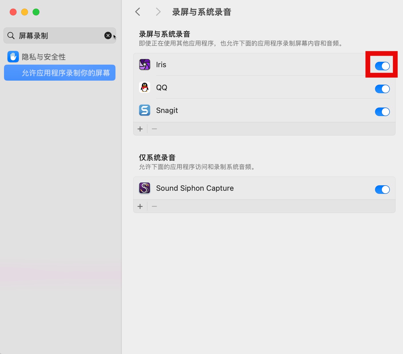 注意事项: 1.安装后记得进 “安全与隐私” > 隐私 > 屏幕录制 中勾选 Iris
