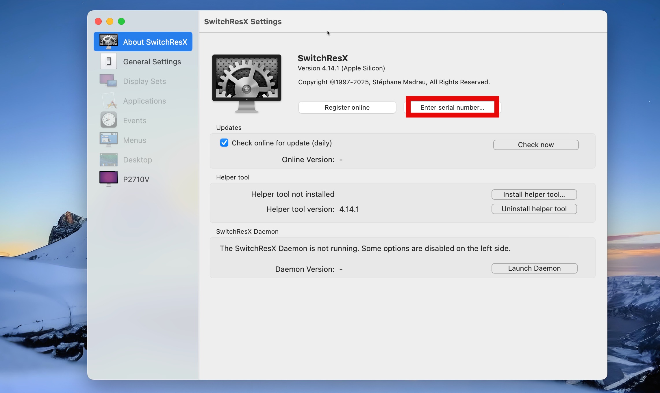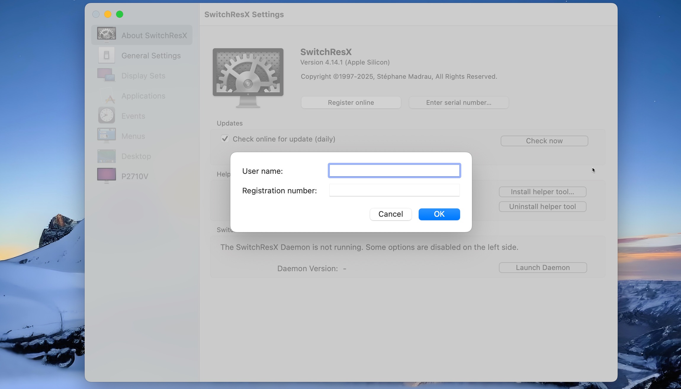弹出注册页面,回到switchresx for Mac激活版安装包,双击打开switchresx 序列号,将switchresx 注册码复制到注册页面,然后点击OK