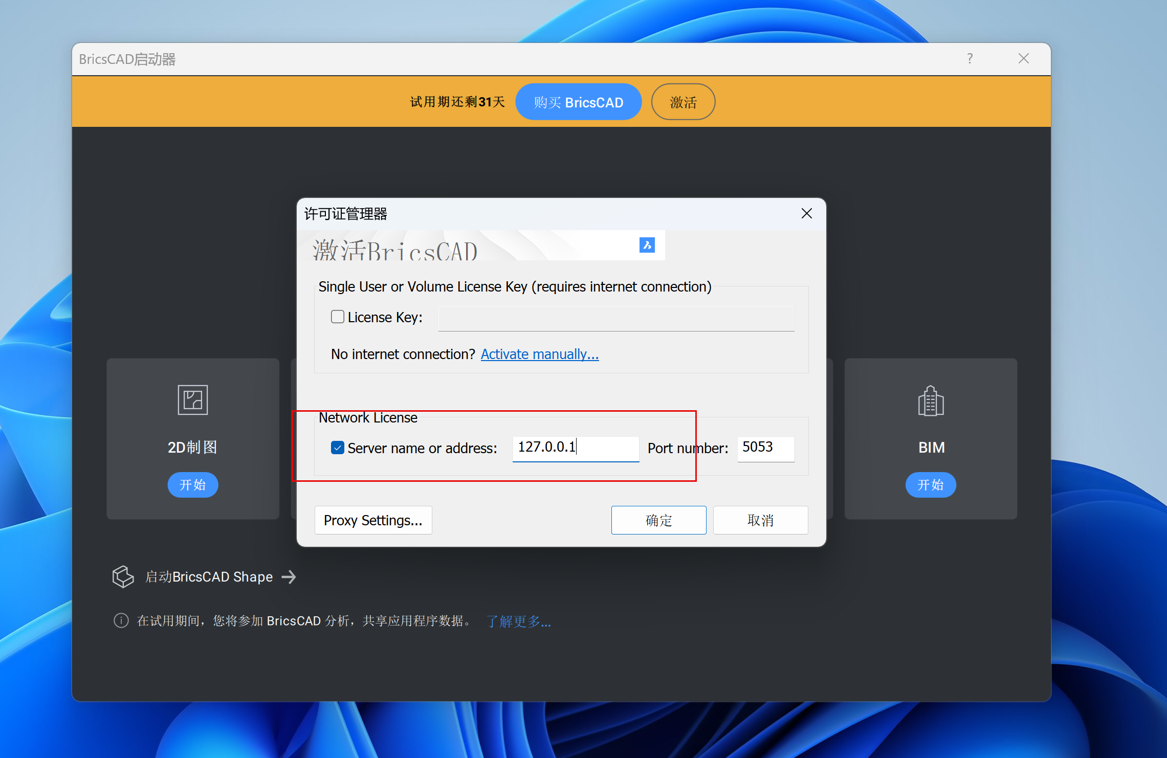 如果提示激活: 打开软件,点击激活→网络许可证→输入127.0.0.1→确定