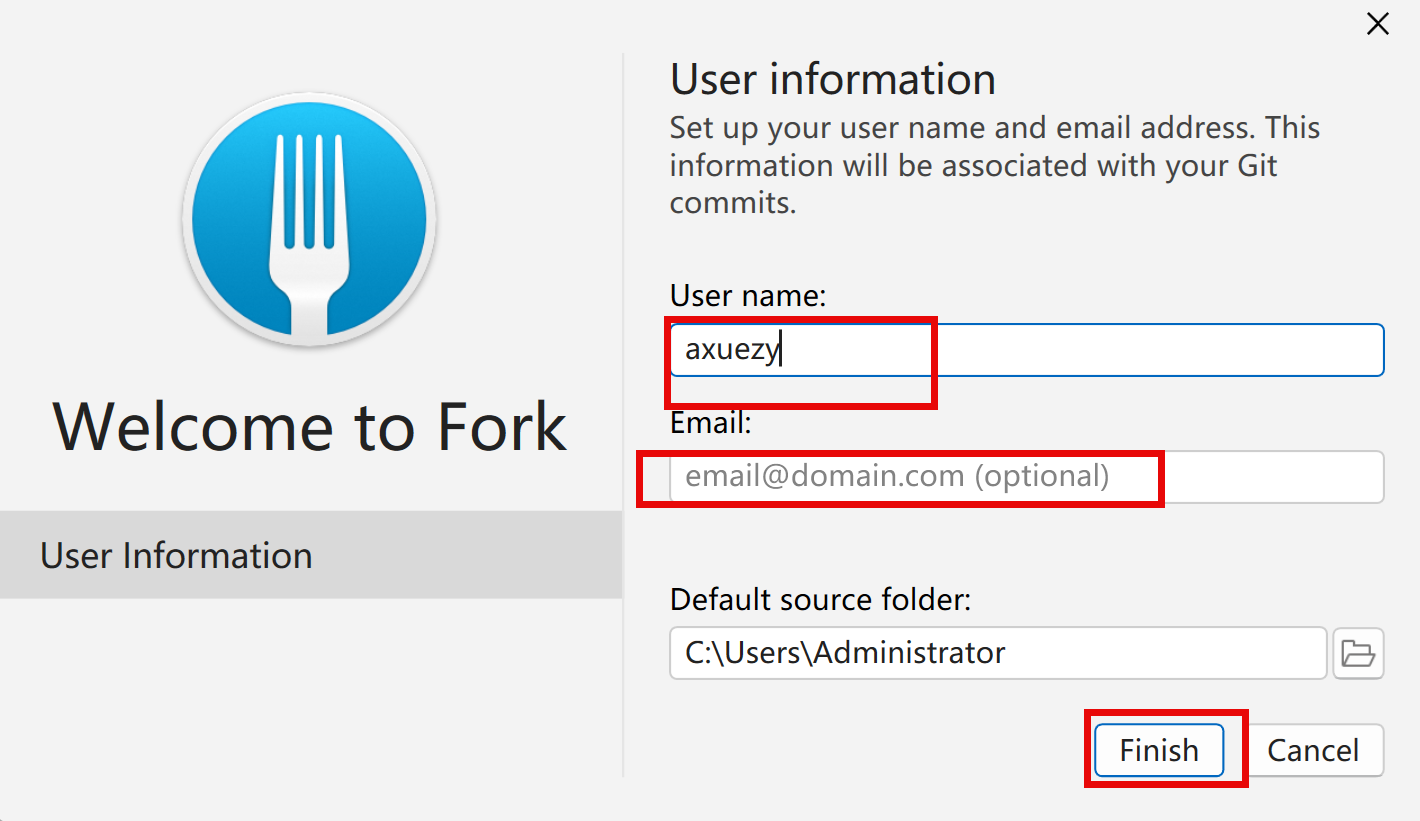 运行开始安装,输入你的用户名和邮箱,点击finish,开始安装