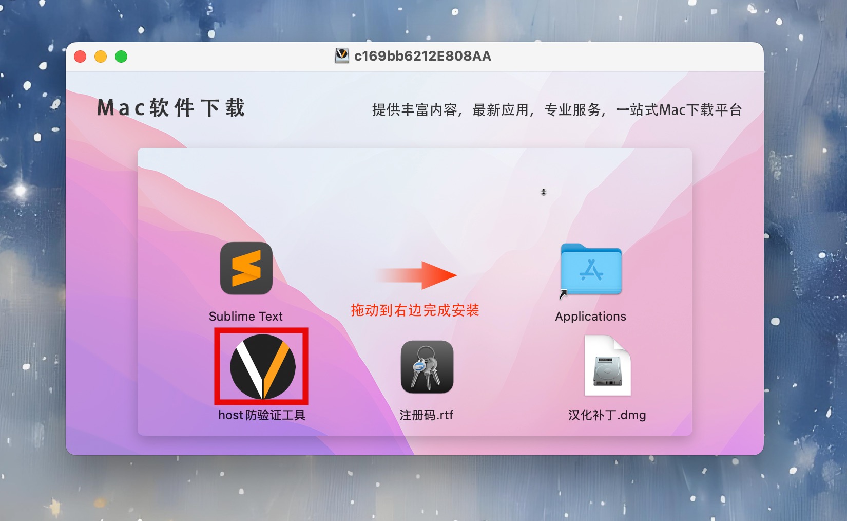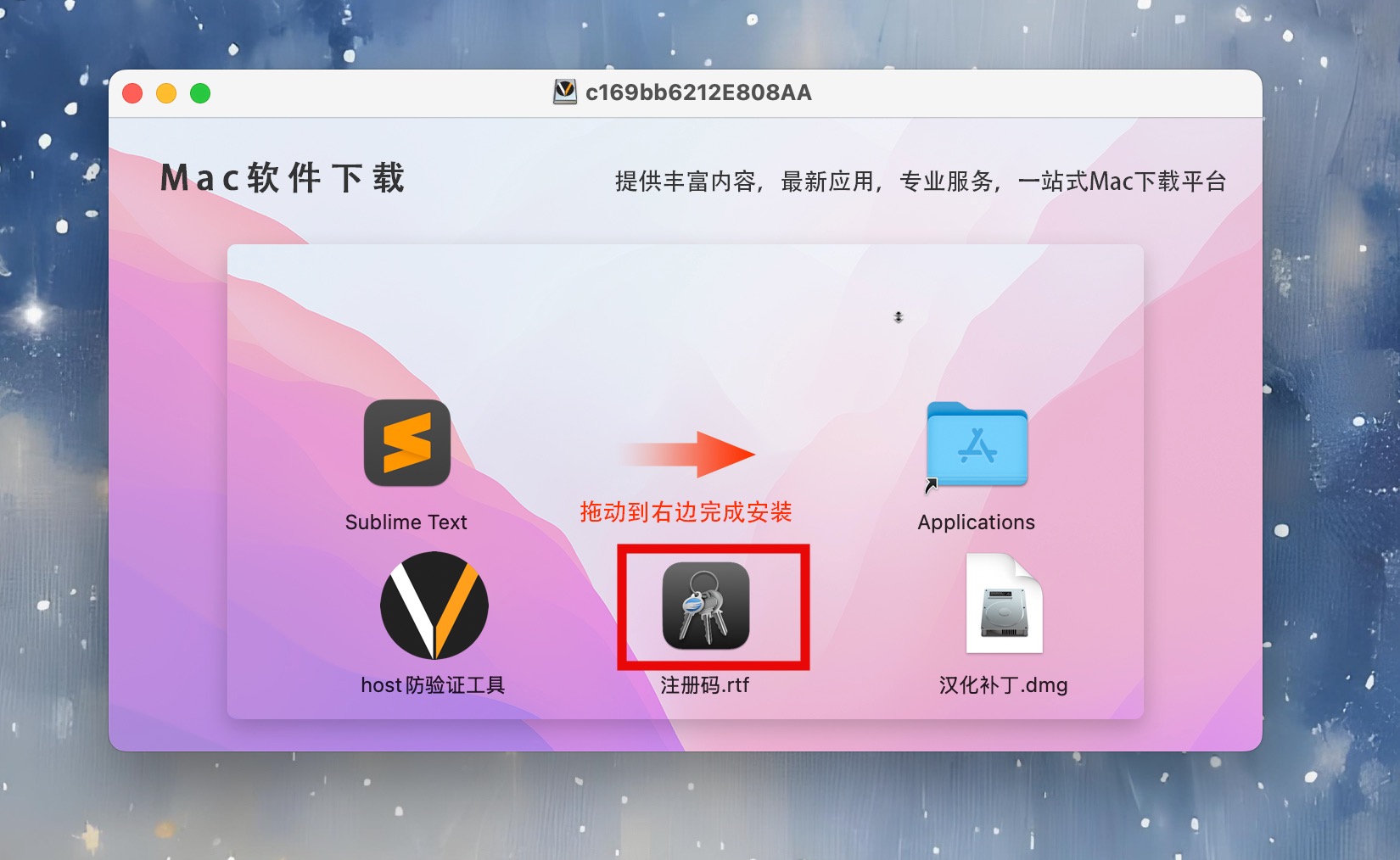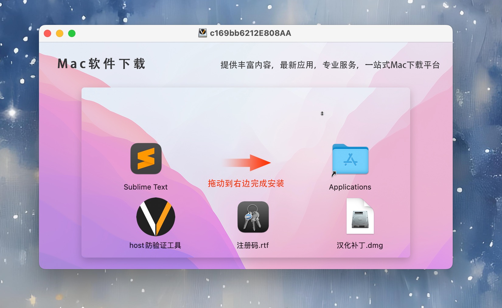 下载完成后打开镜像包,将左侧sublime text拖入右侧应用程序中进行安装