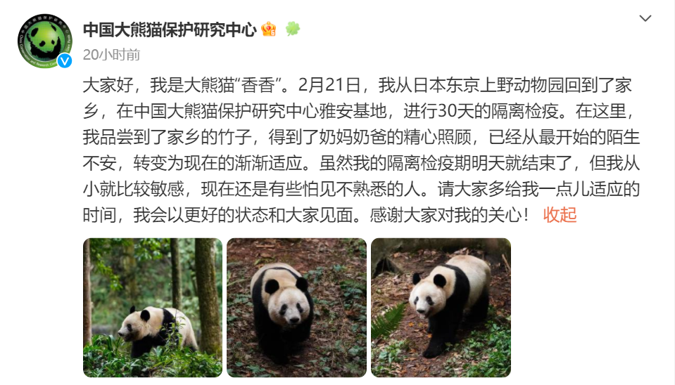 “大家好,我是大熊猫‘香香’。2月21日,我从日本东京上野动物园回到了家乡,在中国大熊猫保护研究中心雅安基地,进行30天的隔离检疫。在这里,我品尝到了家乡的竹子,得到了奶妈奶爸的精心照顾,已经从最开始的陌生不安,转变为现在的渐渐适应。虽然我的隔离检疫期明天就结束了,但我从小就比较敏感,现在还是有些怕见不熟悉的人。请大家多给我一点儿适应的时间,我会以更好的状态和大家见面。感谢大家对我的关心!”