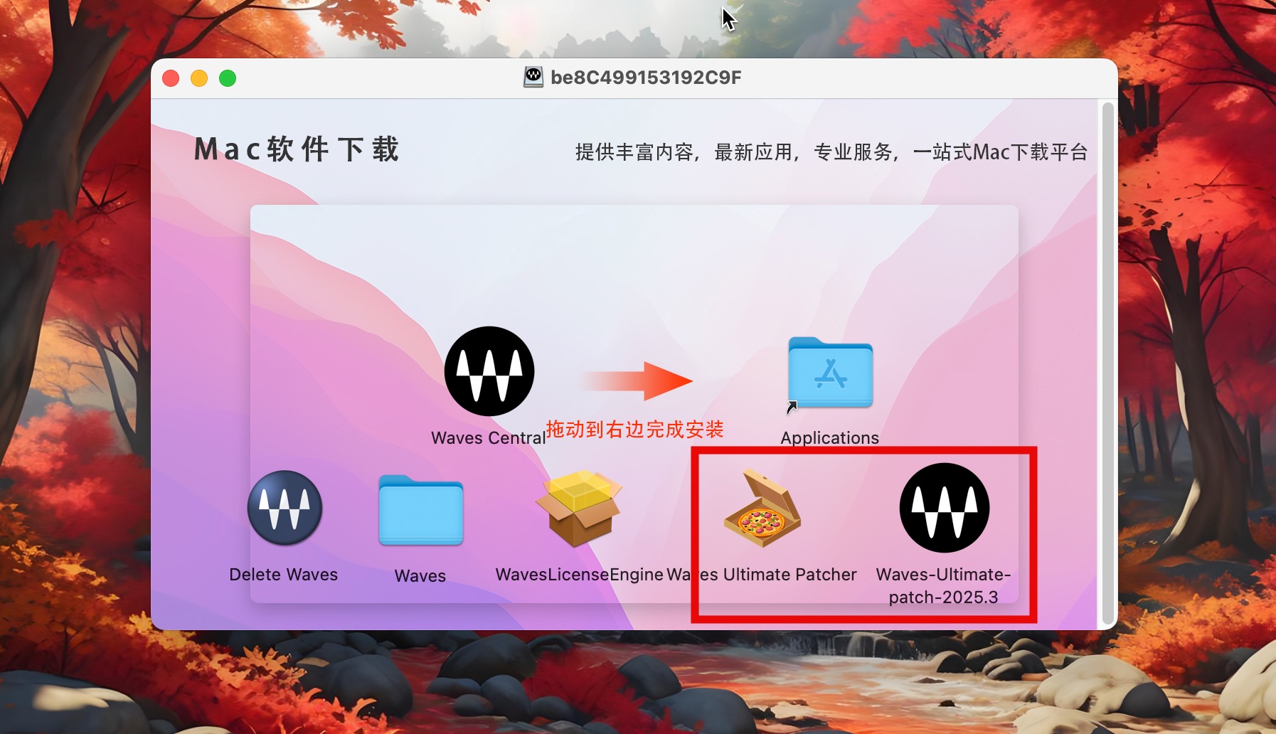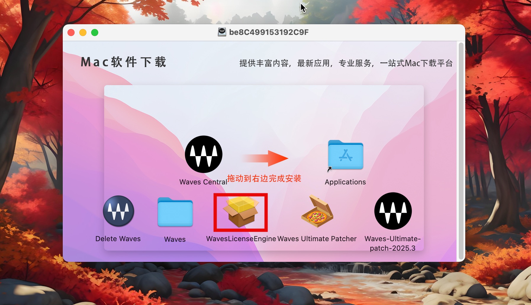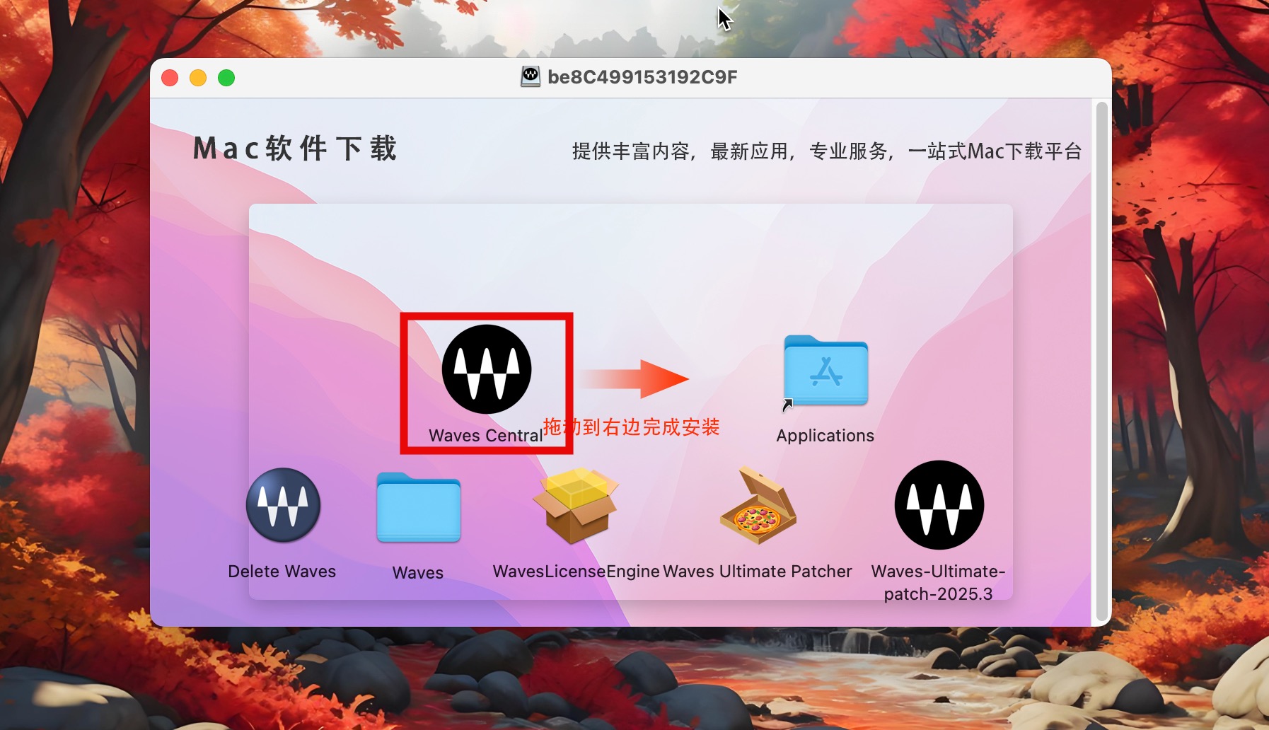 下载完成后打开镜像包,将左侧Waves Central拖入右侧应用程序中进行安装