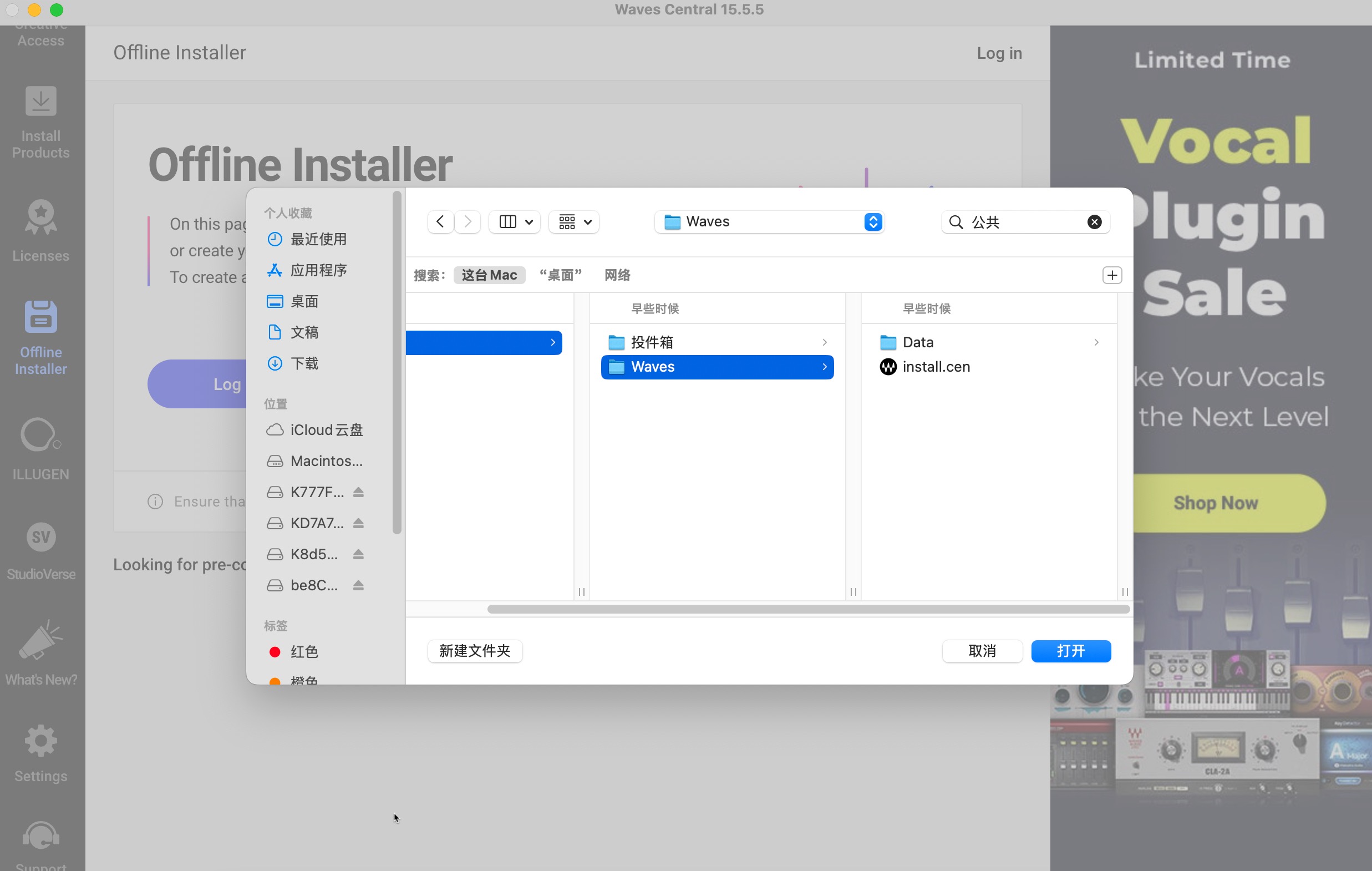 选择之前拖到公共文件夹的Waves,点击打开