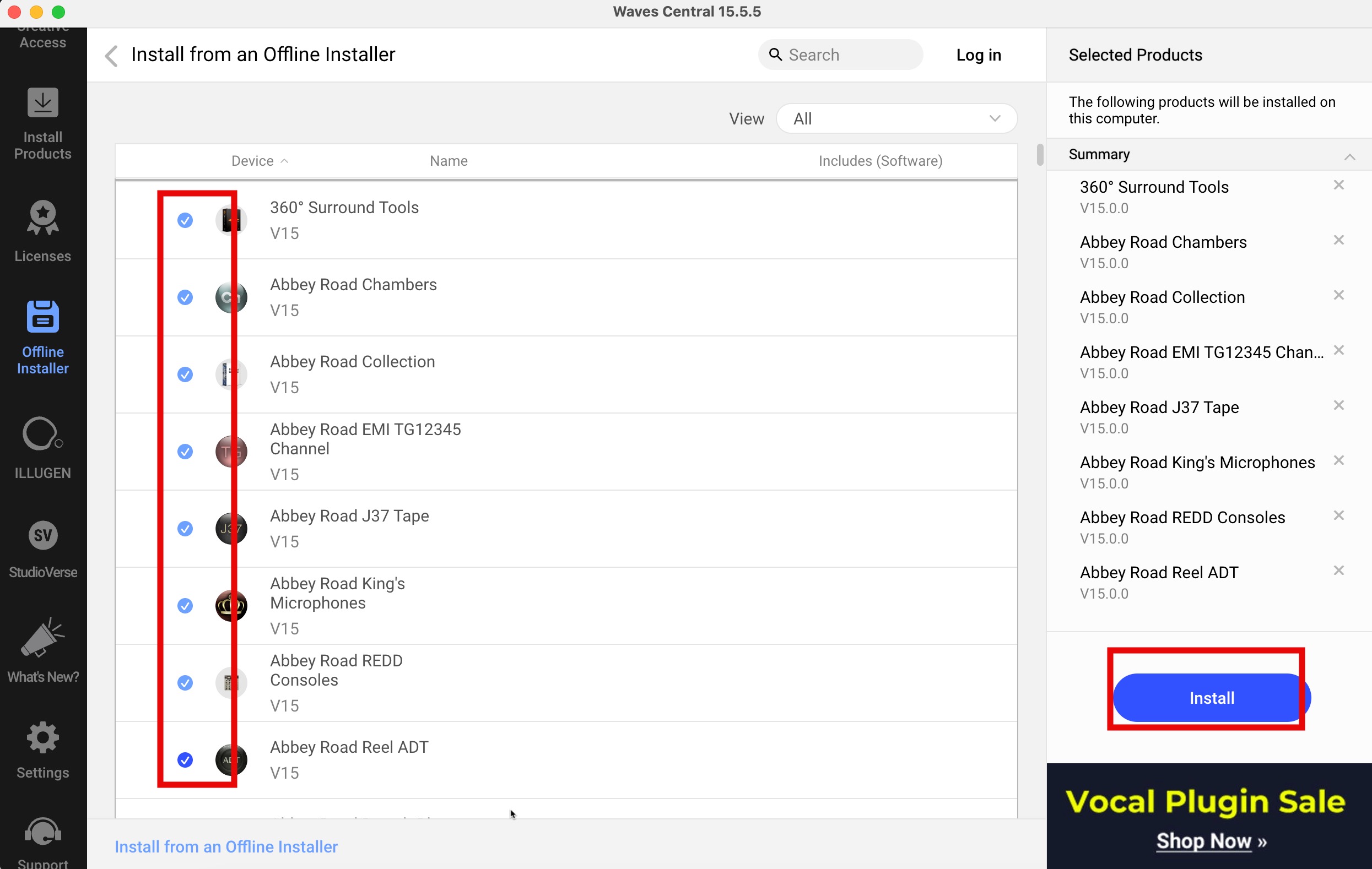 在Waves Complete中选择需要安装的插件,点击右下角INSTALL