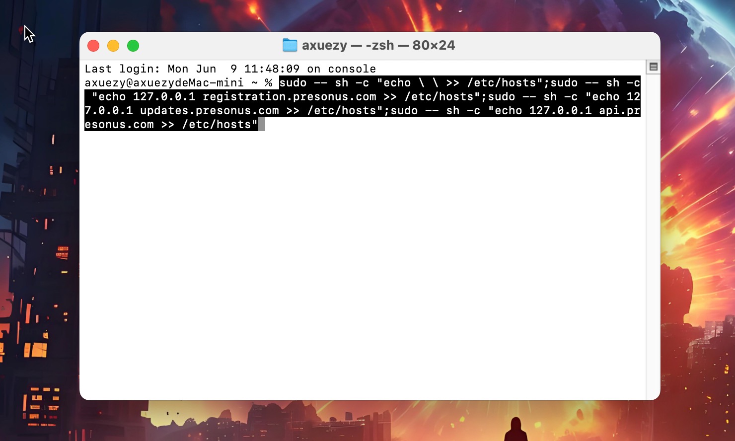 sudo — sh -c “echo \ \ >> /etc/hosts”;sudo — sh -c “echo 127.0.0.1 registration.presonus.com >> /etc/hosts”;sudo — sh -c “echo 127.0.0.1 updates.presonus.com >> /etc/hosts”;sudo — sh -c “echo 127.0.0.1 api.presonus.com >> /etc/hosts”