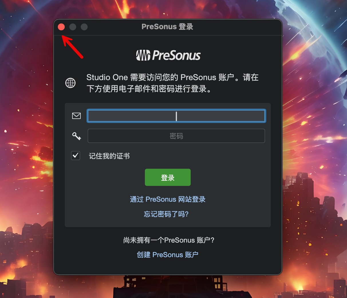 打开应用程序中的StudioOne 7,点击左上角的第一个按钮,关闭窗口