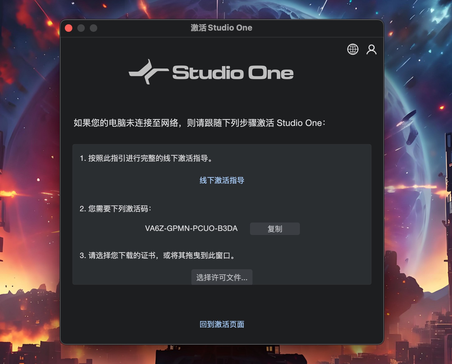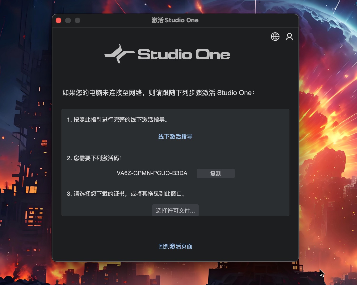 此时桌面会自动生成Studio One 密钥,重新回到Studio One 激活页面。并点击其中的选择许可文件