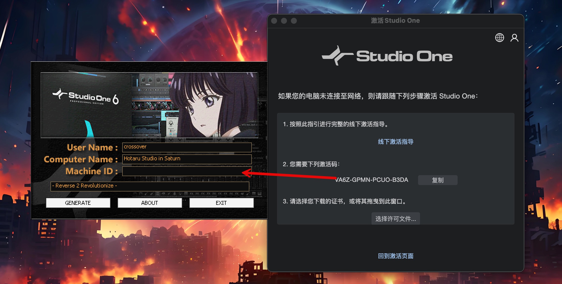 将激活码复制到Machine ID。点击generate生成Studio One密钥