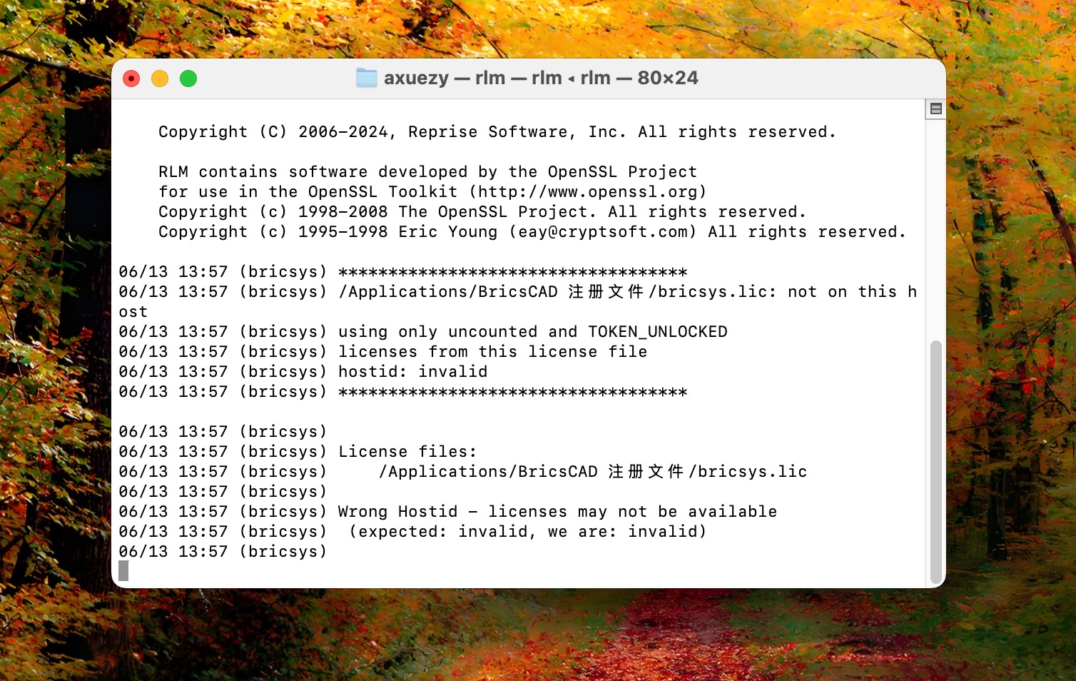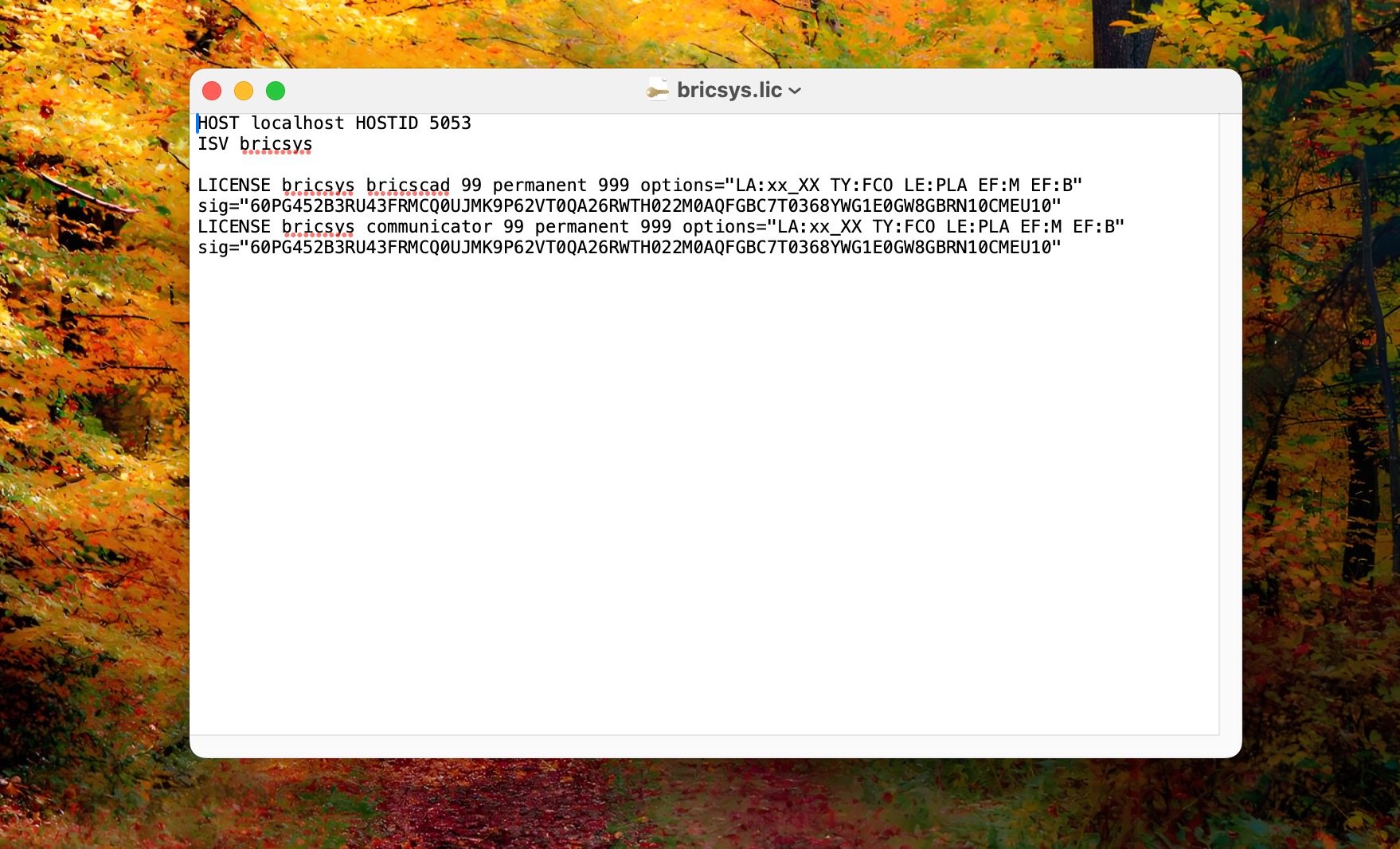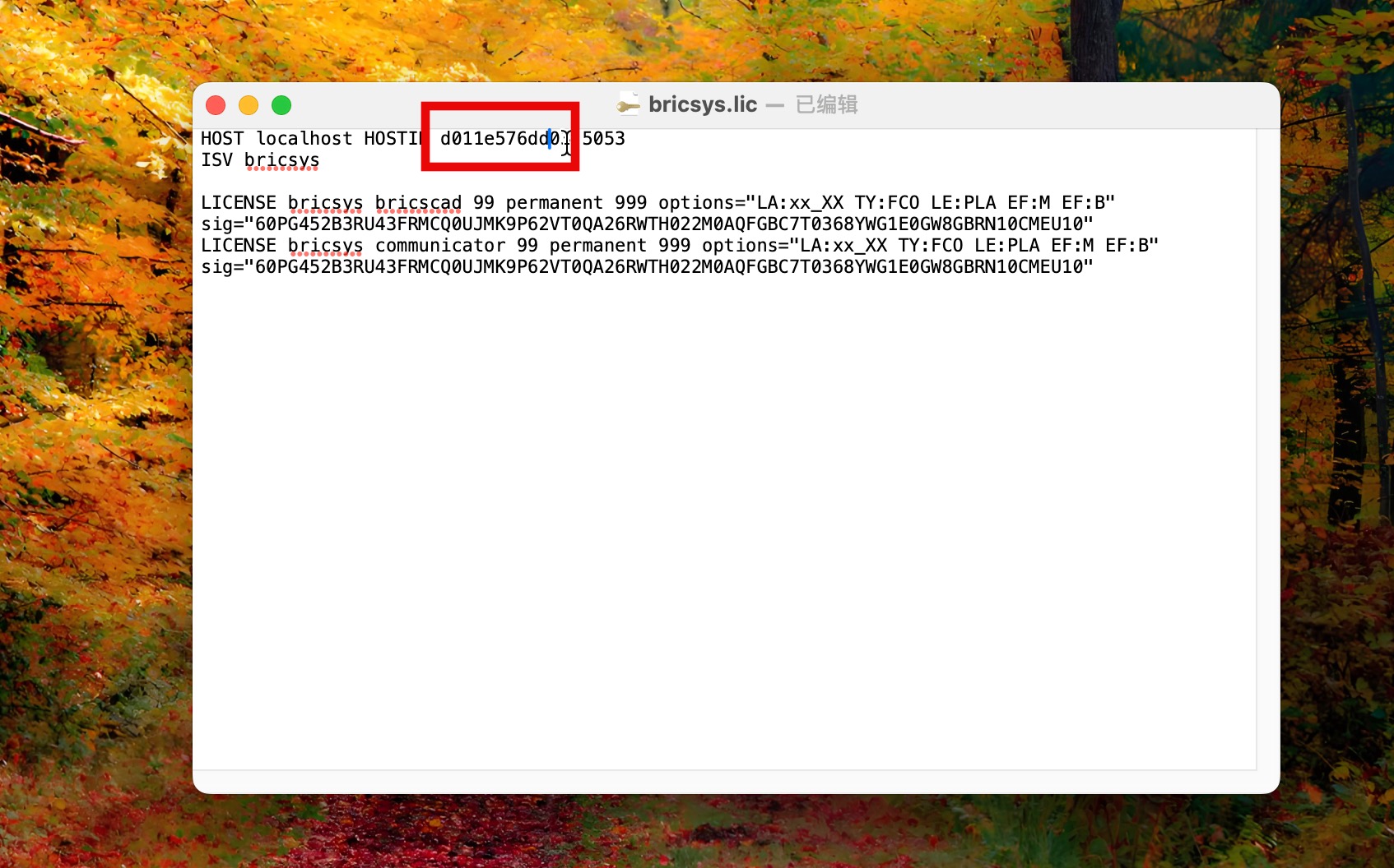返回bricscad 密钥界面,将您的mac地址去掉“:”后,覆盖红框内的 HOSTID ,注意两边括号也要去除,完成后,关闭界面