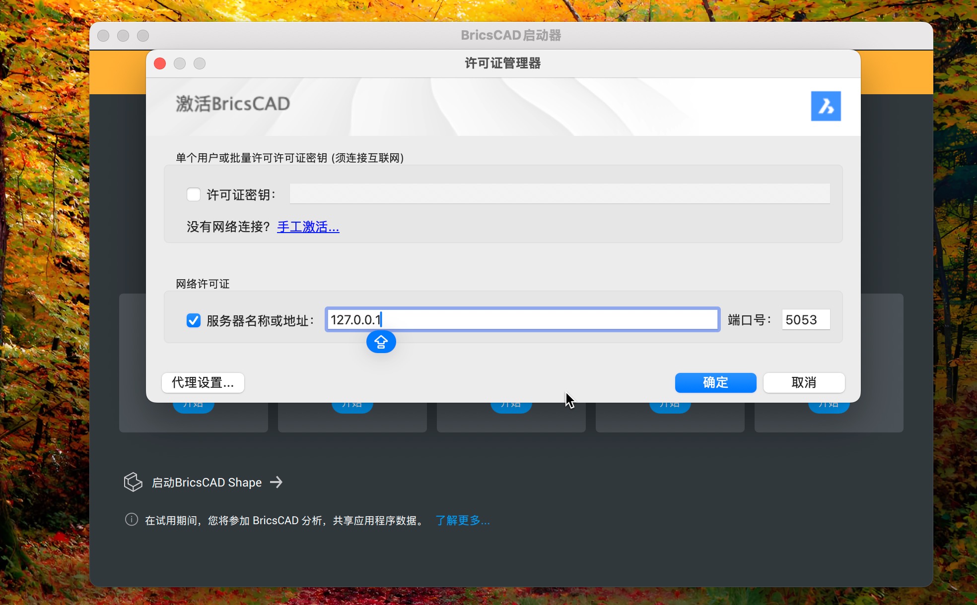 点击激活,勾选网络许可证→输入127.0.0.1→确定