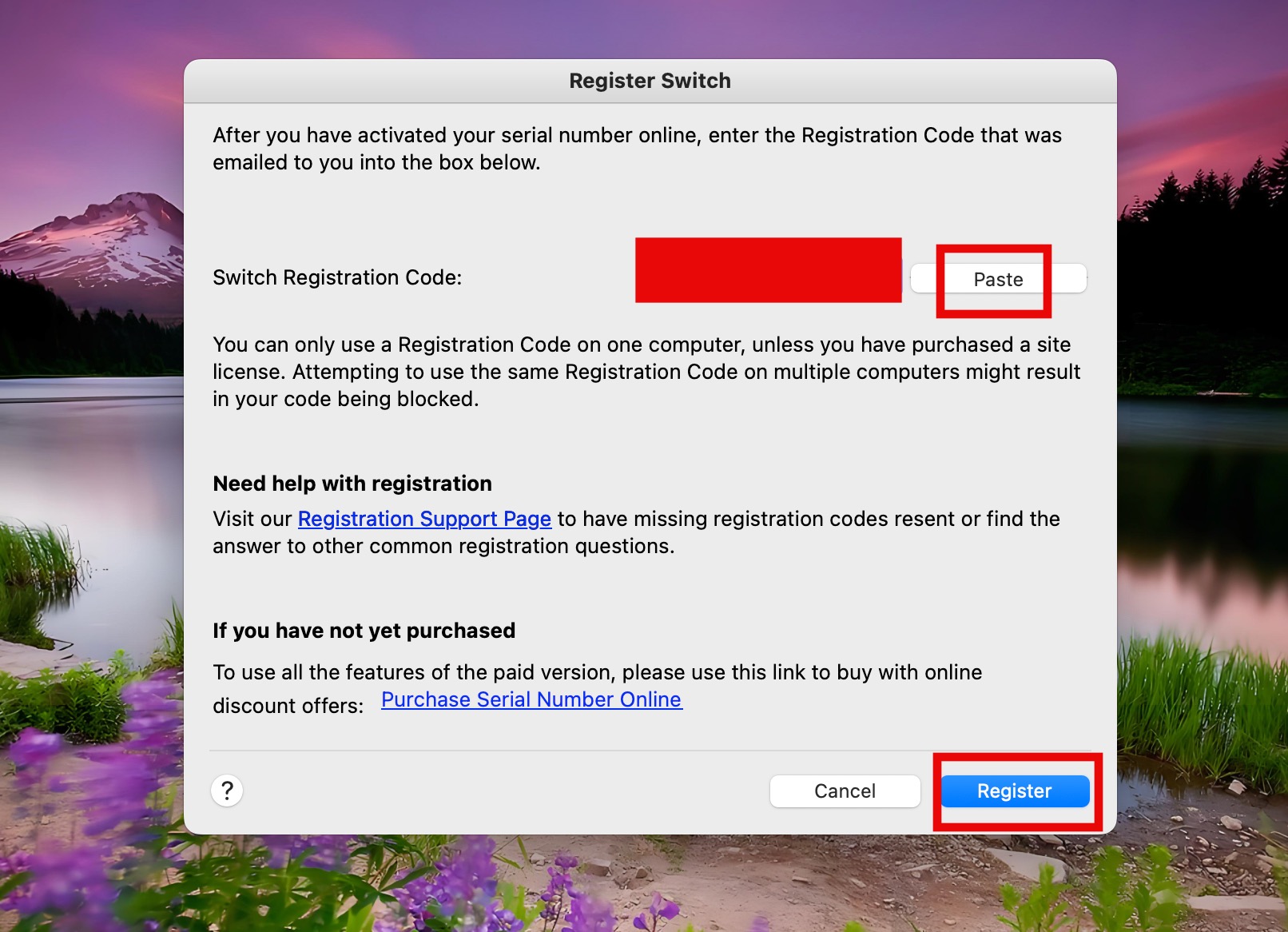 弹出Switch激活窗口,返回镜像包,打开Switch注册码,将Switch注册码复制到对应位置(点击paste即可粘贴注册码)然后点击registear