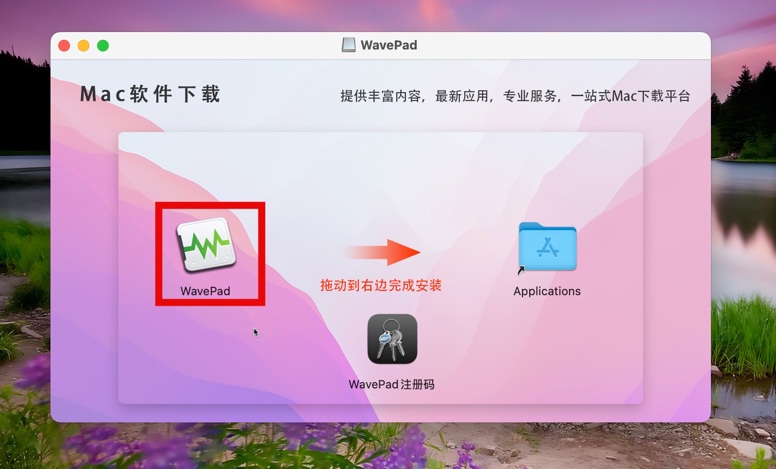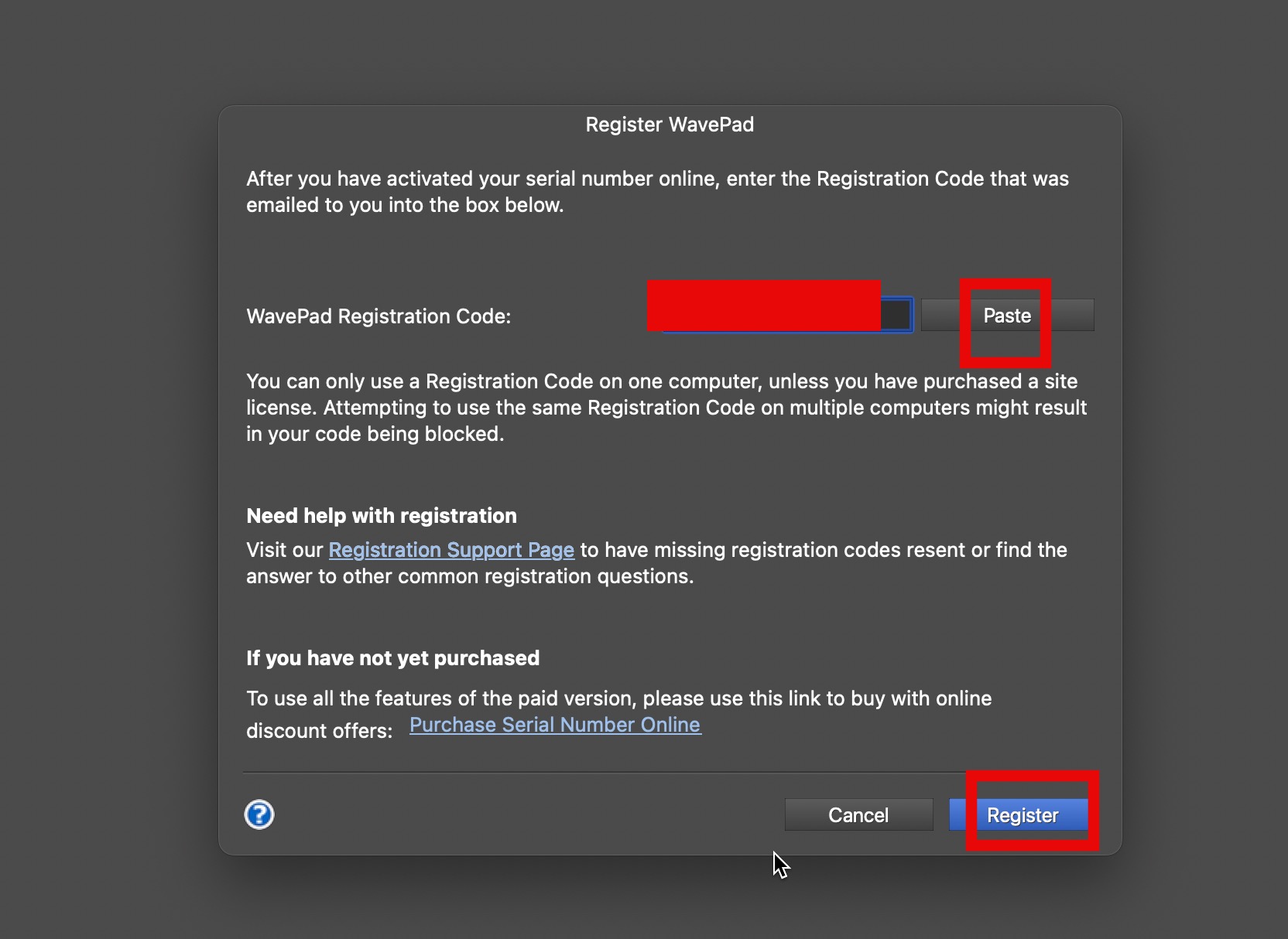 回到NCH WavePad Mater for Mac镜像包,打开WavePad注册码,将NCH WavePad Mater注册码复制到对应位置,(点击pegar即可粘贴注册码)然后点击registear