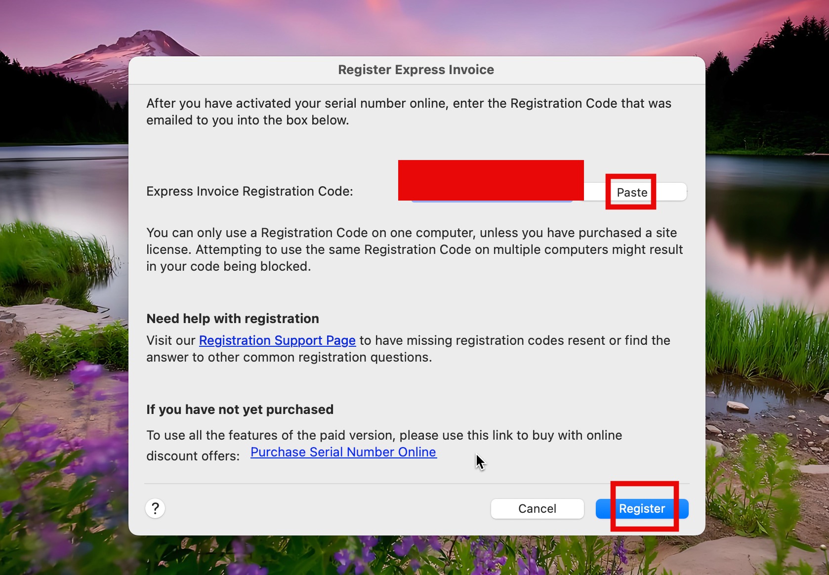 返回Express Invoice安装包,双击打开Express Invoice Plus注册码,复制注册码,回到Express Invoice注册窗口,点击“Pegar”粘贴注册码,然后点击“Registrar”
