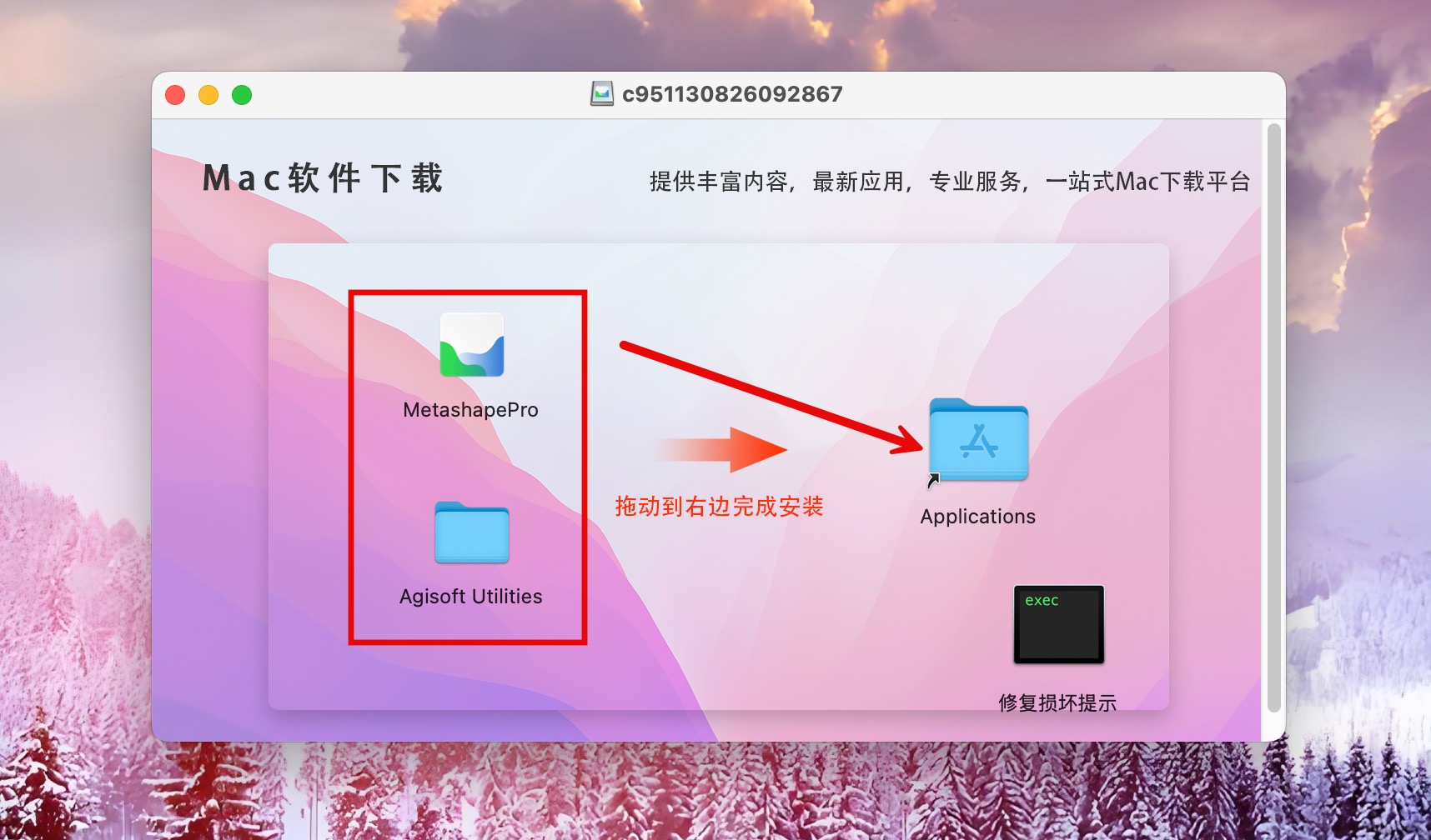 下载完成后打开,将左侧MetashapePro和Agisoft Utilities拖入右侧Applications中进行安装即可