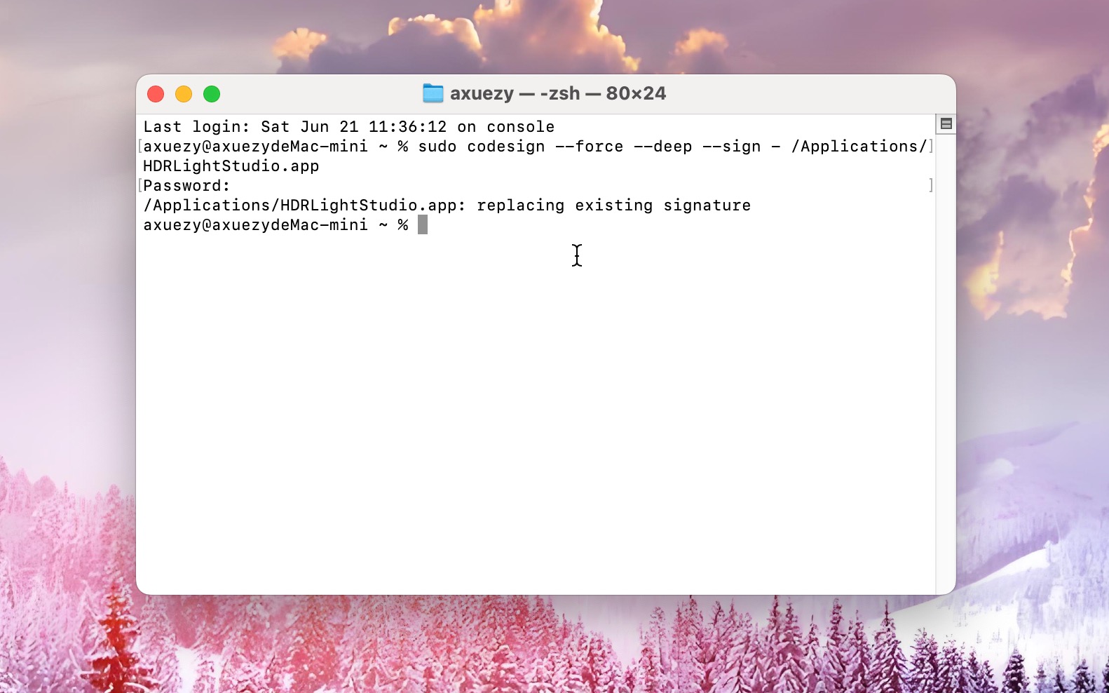 打开终端,将sudo codesign –force –deep –sign – /Applications/HDRLightStudio.app复制到终端中回车,输入电脑密码