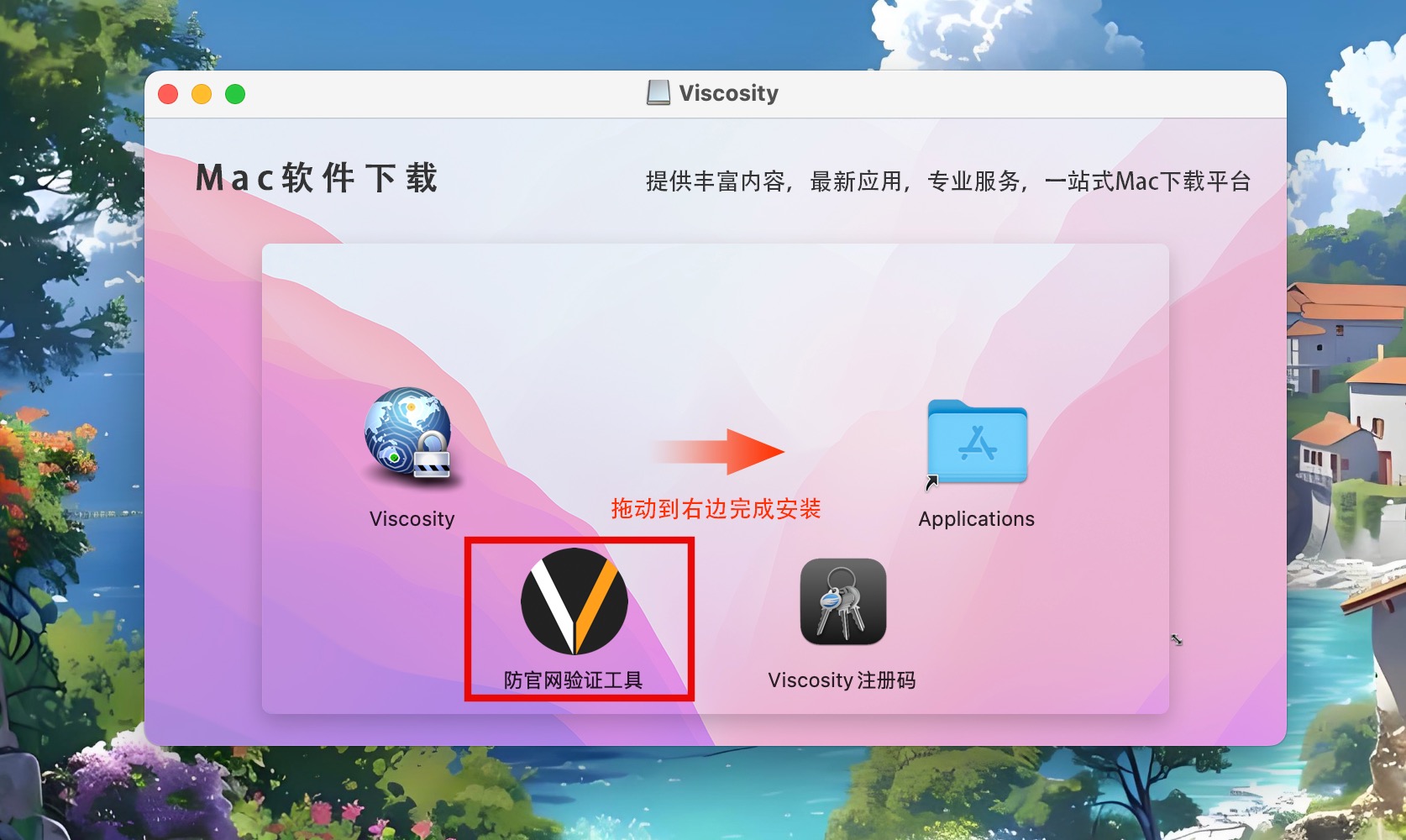 下载完成后,打开Viscosity.dmg安装包,拖动软件到右边的应用程序中进行安装