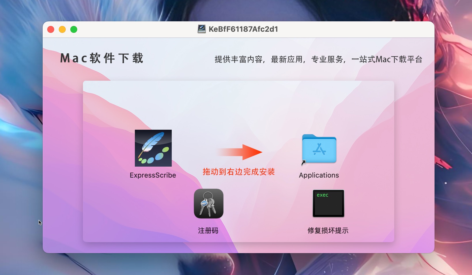 安装包打开后, 将左侧ExpressScribe拖入右侧Applicatios应用程序中进行安装