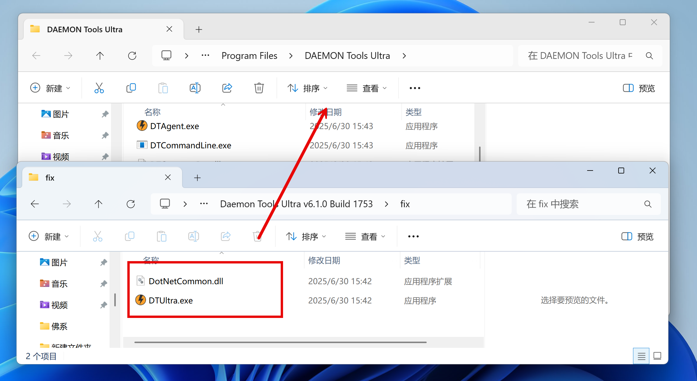 打开安装包中的“fix”文件夹,将里面的两个文件全部复制到安装目录下,并选择替换;