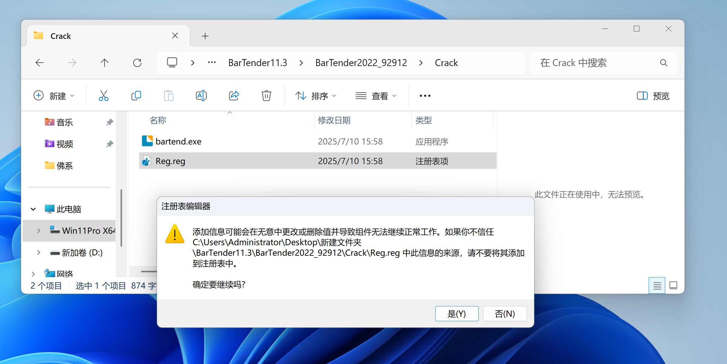双击”Reg.reg”导入注册,点击”是”,添加成功点击”确定”;